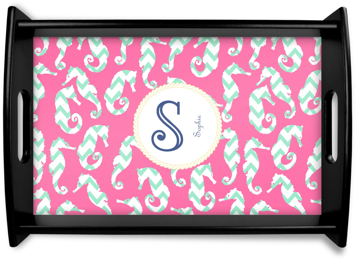 This sea horse design combines the beauty of seahorses with the fun loving chevron pattern. The design features mint, a bubble gum pink background and some gold colors, all of which can be customized to your favorite colors with just a few clicks!