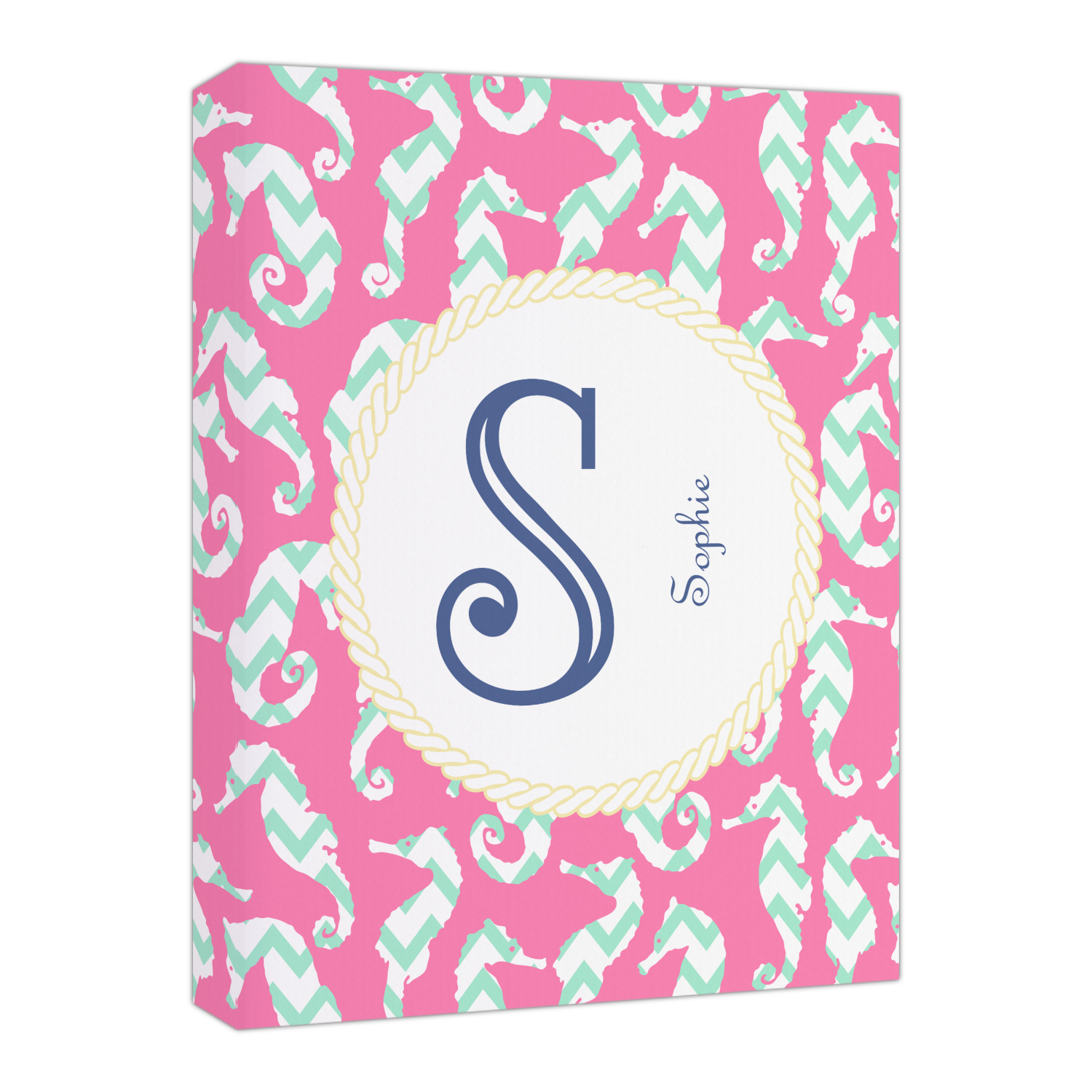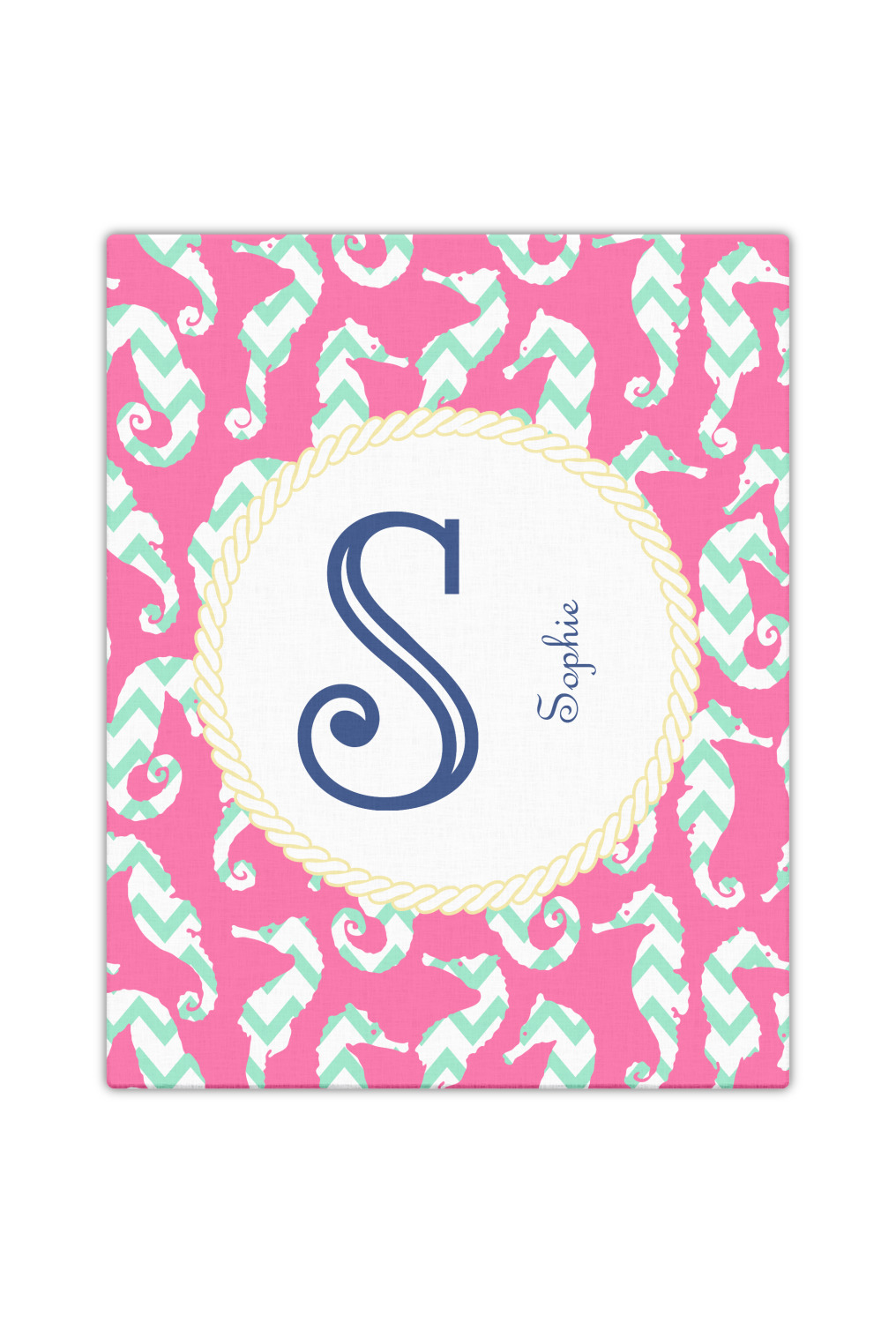 This sea horse design combines the beauty of seahorses with the fun loving chevron pattern. The design features mint, a bubble gum pink background and some gold colors, all of which can be customized to your favorite colors with just a few clicks!
