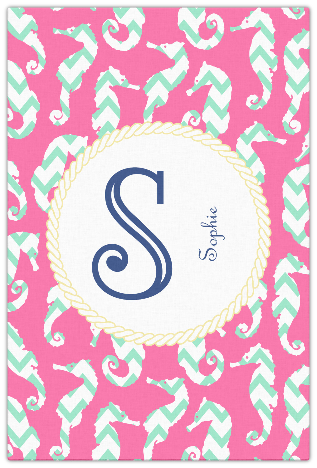 This sea horse design combines the beauty of seahorses with the fun loving chevron pattern. The design features mint, a bubble gum pink background and some gold colors, all of which can be customized to your favorite colors with just a few clicks!