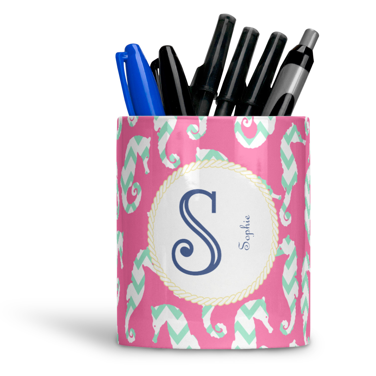Made from white ceramic, this pen holder displays your personalized design across its surface. This pen organizer measures at 3.75" high by 3.25 inches diameter and has ample space for several pens, pencils, scissors, markers, and more! This is also a multipurpose accessory; you can use it to store makeup brushes, other utensils, and more!