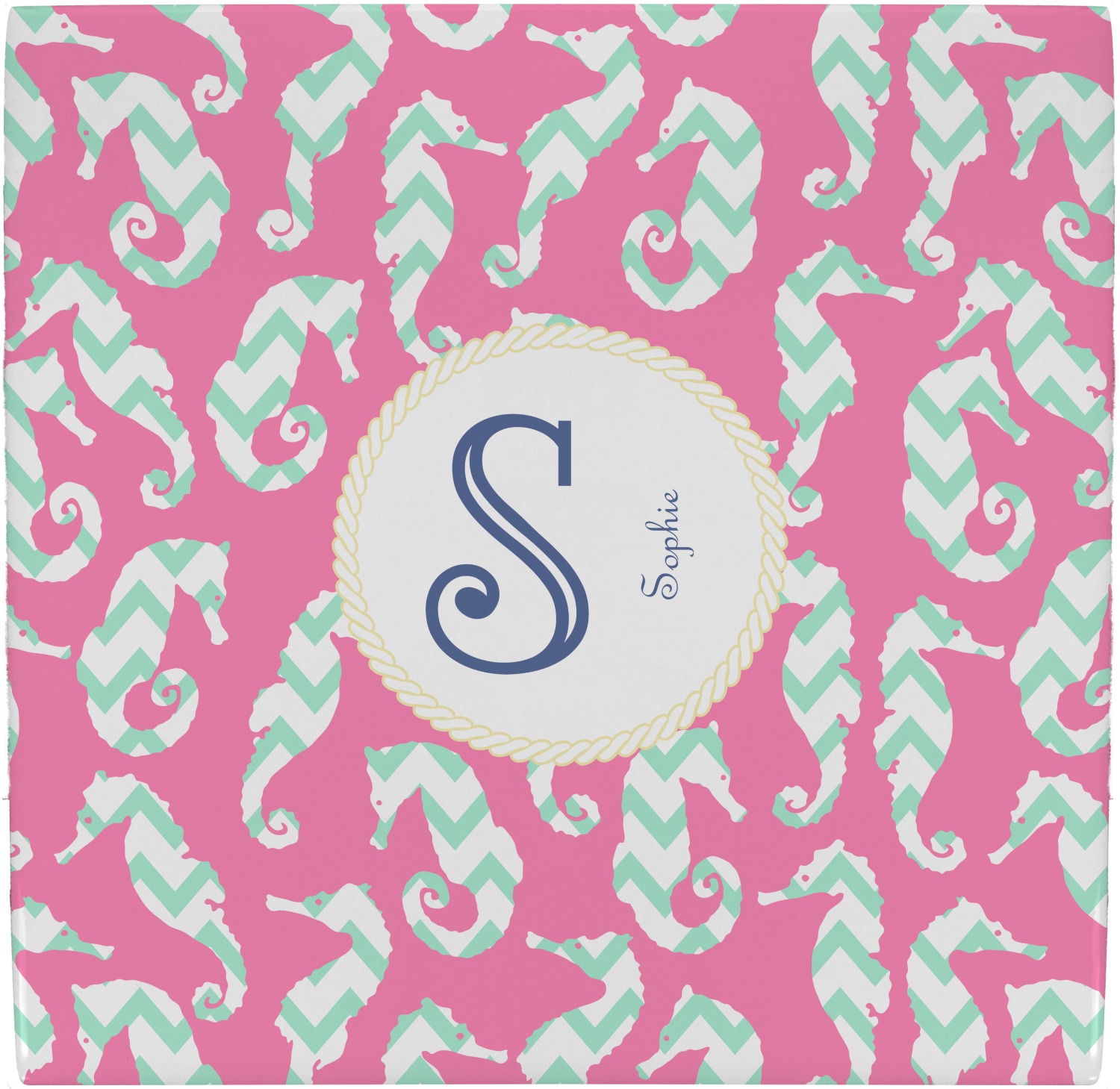 This sea horse design combines the beauty of seahorses with the fun loving chevron pattern. The design features mint, a bubble gum pink background and some gold colors, all of which can be customized to your favorite colors with just a few clicks!