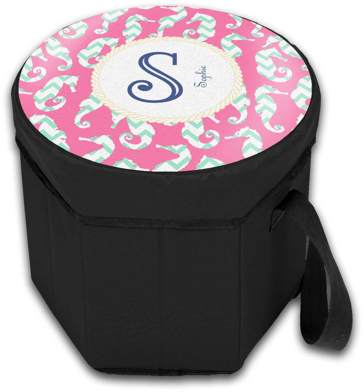 Our collapsible insulated coolers feature a unique six-sided hexagon shape, are lightweight, durable and can be turned into a seat. This cooler is fully insulated with silver foil lining to keep food and drinks hot or cold, and has a 12-quart capacity. Although this cooler collapses for easy transport, hidden inside are composition panels made of sturdy wood that give the frame strength and allow this cooler to be used as a seat. Simply sit down on the personalized cover and give your legs a break! (Maximum weight capacity of 200 pounds.)
