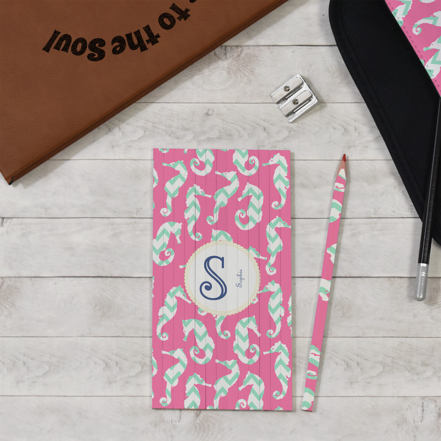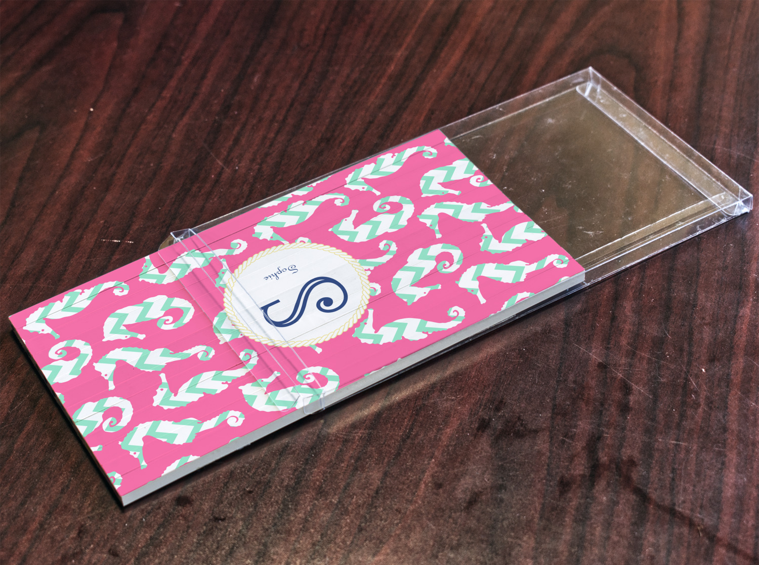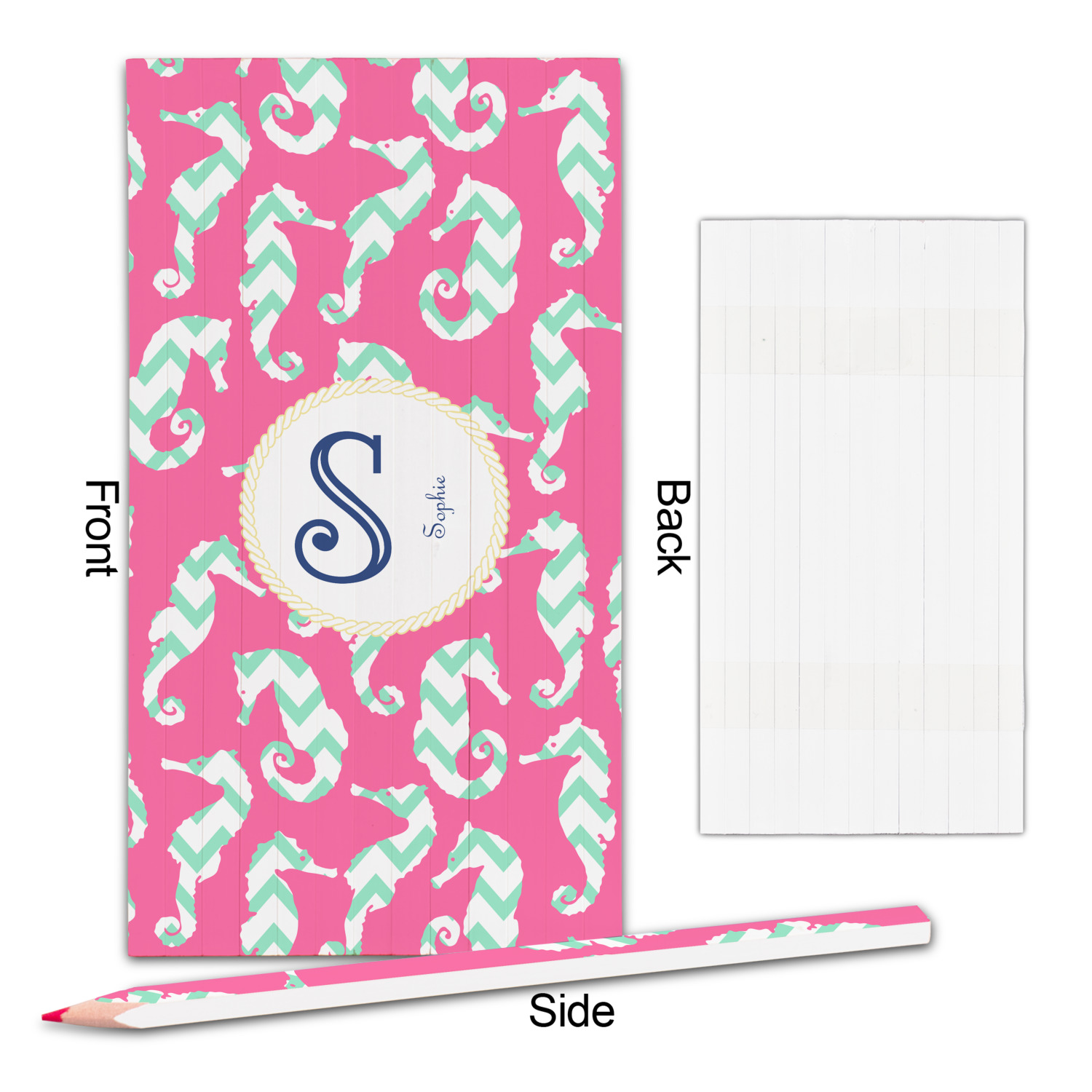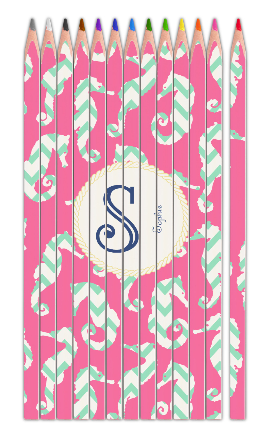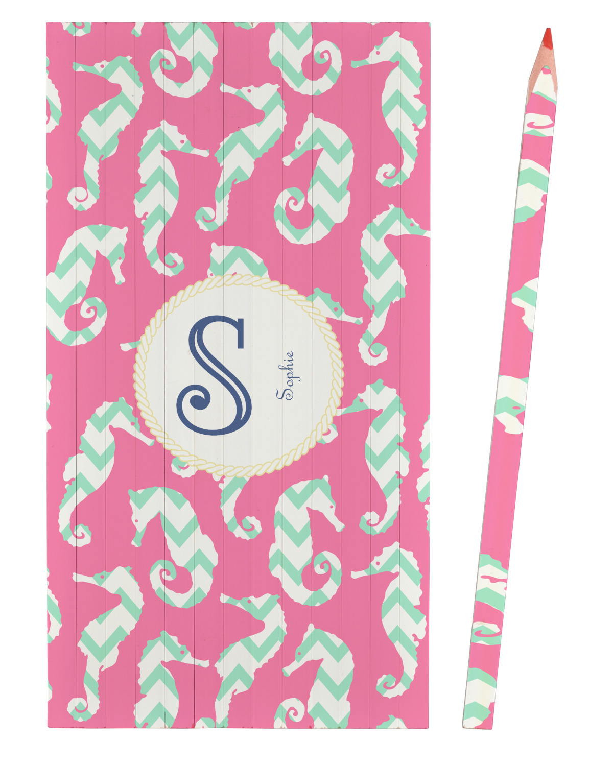 This sea horse design combines the beauty of seahorses with the fun loving chevron pattern. The design features mint, a bubble gum pink background and some gold colors, all of which can be customized to your favorite colors with just a few clicks!
