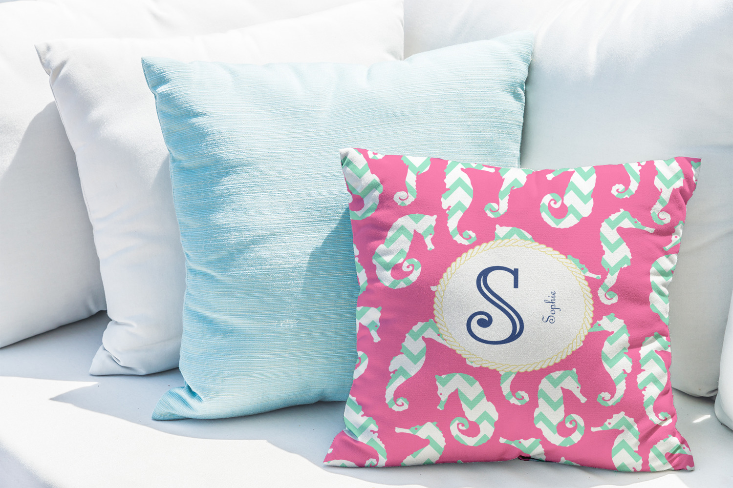This sea horse design combines the beauty of seahorses with the fun loving chevron pattern. The design features mint, a bubble gum pink background and some gold colors, all of which can be customized to your favorite colors with just a few clicks!