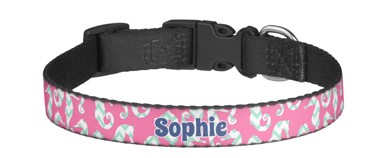 This sturdy collar, made from a durable nylon weave, will outlive your dog's episodes of excited tugging and pulling. Courtesy of its thick plastic buckle and adjuster, this collar is adjustable and accommodating of any dog. Structurally, the collar is a single piece of nylon weave that is sewn together, and features a solid metal loop where you can attach a leash or dog tag. We print and display your dog's name and pattern across the middle of the personalized dog collar.