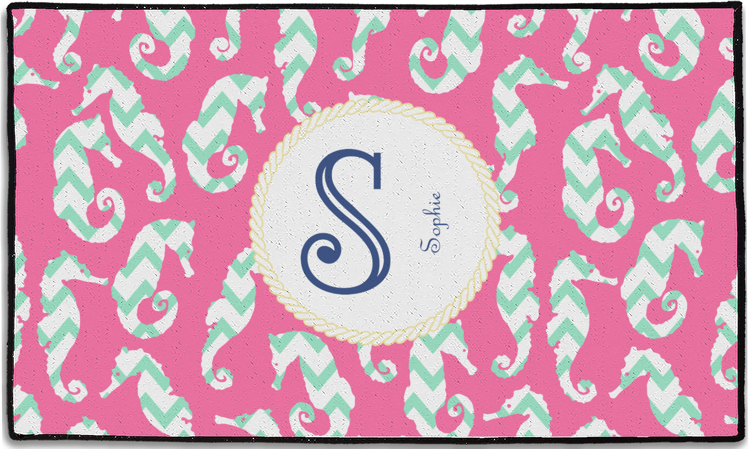 This sea horse design combines the beauty of seahorses with the fun loving chevron pattern. The design features mint, a bubble gum pink background and some gold colors, all of which can be customized to your favorite colors with just a few clicks!