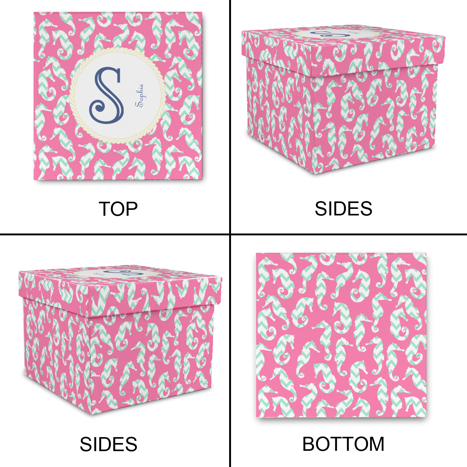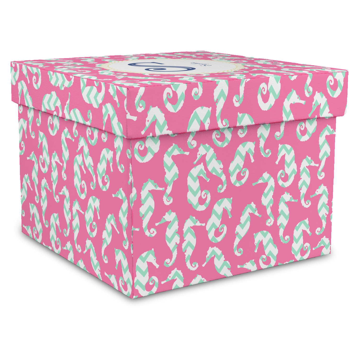 This sea horse design combines the beauty of seahorses with the fun loving chevron pattern. The design features mint, a bubble gum pink background and some gold colors, all of which can be customized to your favorite colors with just a few clicks!