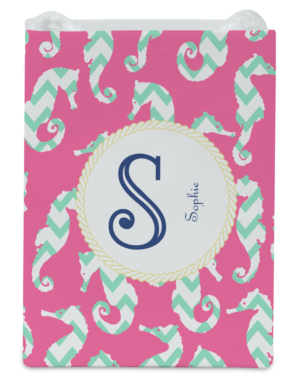 This sea horse design combines the beauty of seahorses with the fun loving chevron pattern. The design features mint, a bubble gum pink background and some gold colors, all of which can be customized to your favorite colors with just a few clicks!