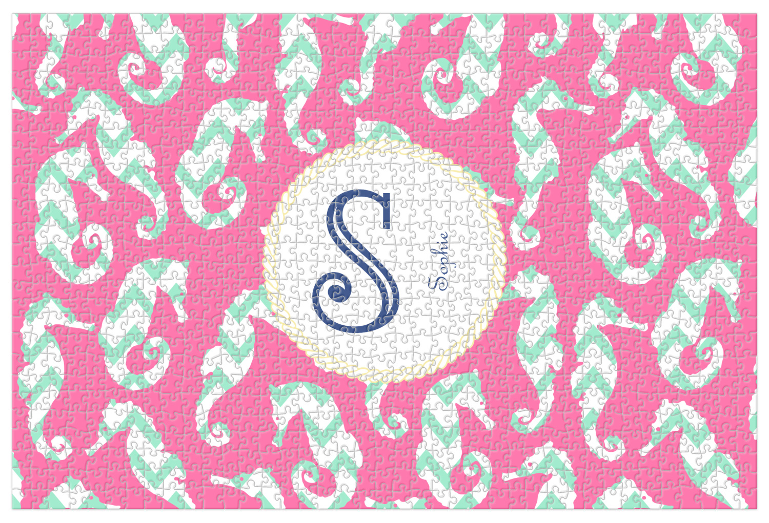 This sea horse design combines the beauty of seahorses with the fun loving chevron pattern. The design features mint, a bubble gum pink background and some gold colors, all of which can be customized to your favorite colors with just a few clicks!