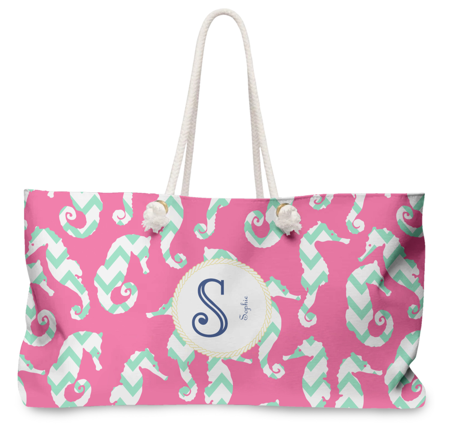 Our oversized weekender tote with rope handles is perfect for your weekend at the beach or on the town. This large tote are 24" W X 13" H, with a 5" gusset and a 27" thick rope handles with a knot that is put through a grommeted brass hole.