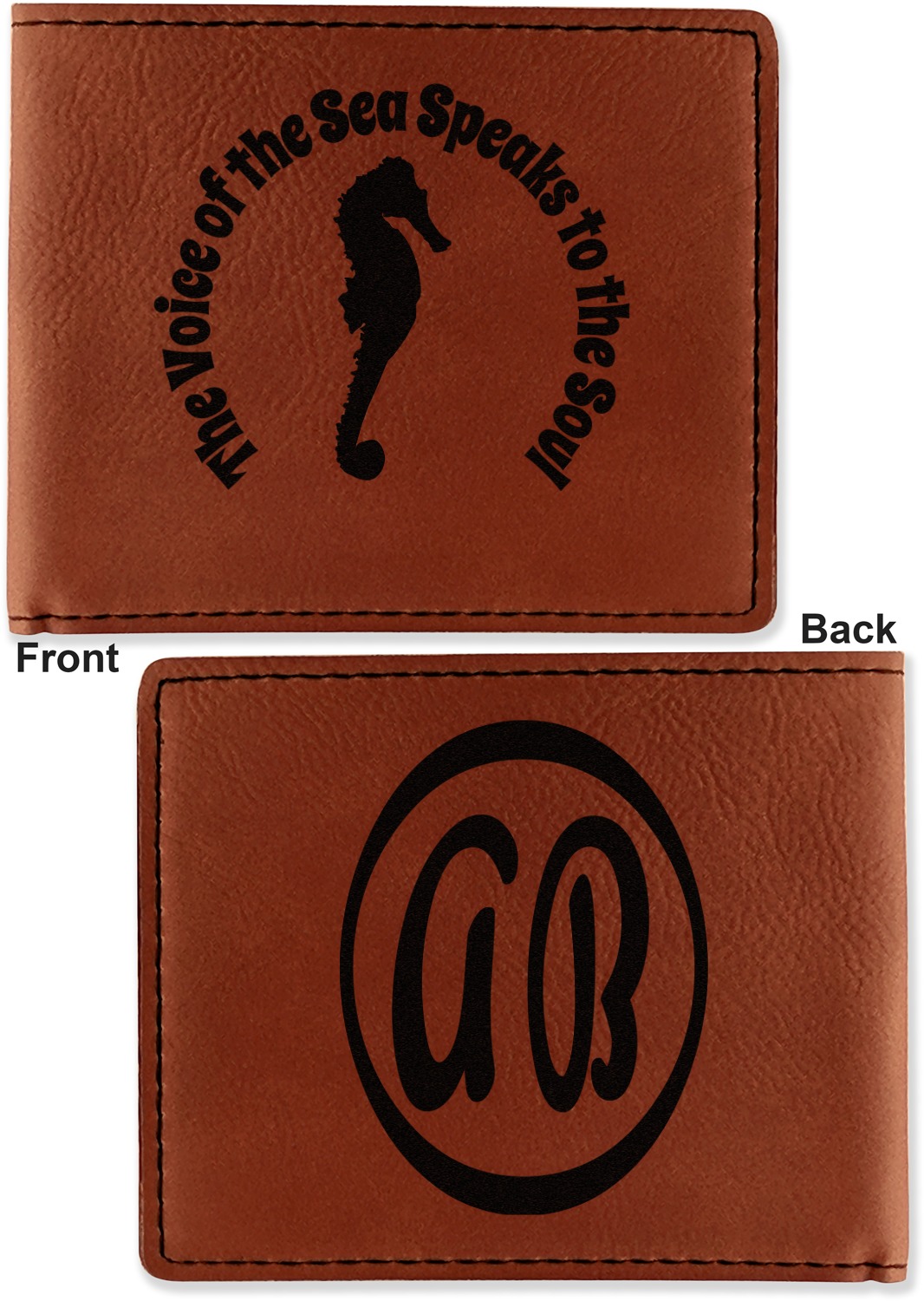 Your bifold wallet will be personalized by laser engraving, which will be a black color on the wallet. Choose a graphic, text, or monogram to personalize your wallet. There are thousands of choices in our design center.