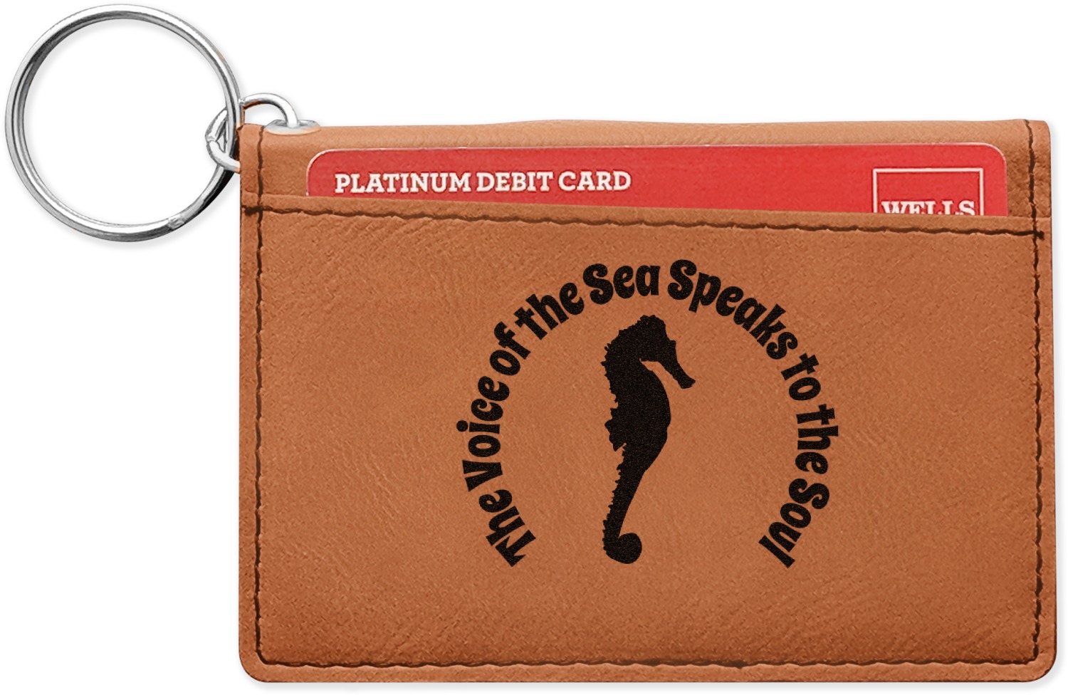 These ID wallet keychains features three pockets on the inside to accommodate your ID and your most frequently used cards. Another pocket occupies the front of the wallet's exterior, and can hold some cash or another card. The wallet is accompanied by a thick metal ring for easy attachment to a belt clip or purse. Each card holder keychain measures at 4.25 by 3 inches and is a beautiful, cognac, medium-brown shade. The personalized monogram, font, or graphic of your choosing is laser engraved into the surface of the wallet, creating a black imprint. We sell these ID wallets in two models: single sided and double sided engraving.