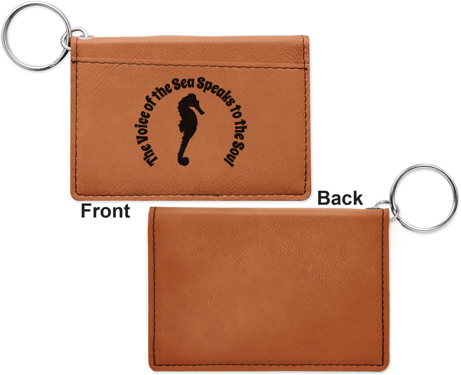 These ID wallet keychains features three pockets on the inside to accommodate your ID and your most frequently used cards. Another pocket occupies the front of the wallet's exterior, and can hold some cash or another card. The wallet is accompanied by a thick metal ring for easy attachment to a belt clip or purse. Each card holder keychain measures at 4.25 by 3 inches and is a beautiful, cognac, medium-brown shade. The personalized monogram, font, or graphic of your choosing is laser engraved into the surface of the wallet, creating a black imprint. We sell these ID wallets in two models: single sided and double sided engraving.