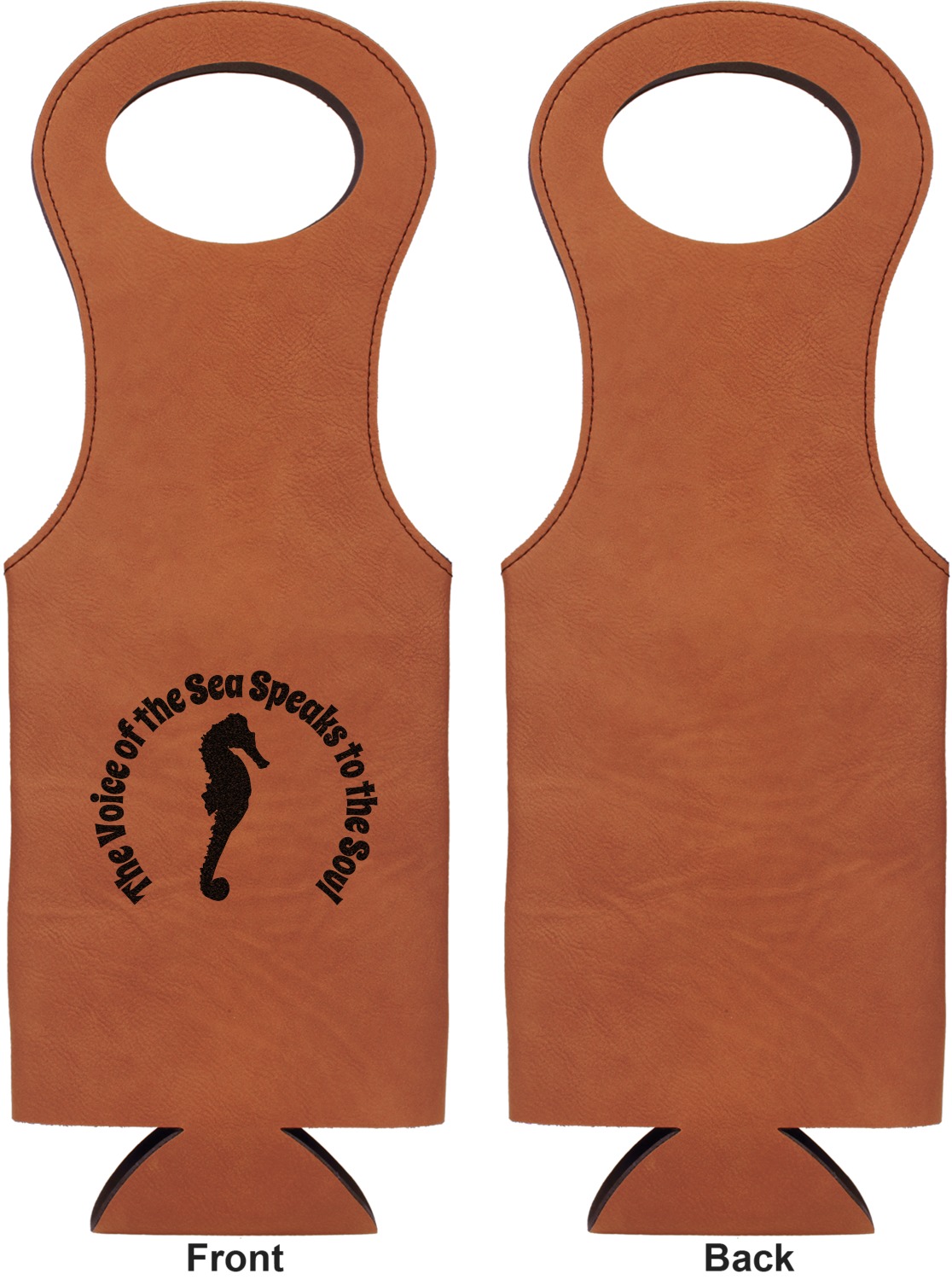 This wine carrier is made from a stunning leatherette, in a cognac-brown color. Strong, black stitching lines the sides of your wine bottle bag and provides extra durability. The interior is lined with a padded, black material to allow for a snug fit once your bottle is placed inside. At the top of this wine gift bag, you'll find two oval shaped handles that elegantly complements the rest of the bag's style. We provide you with the option of laser-engraving the front, or the front and back of your new personalized wine bag!