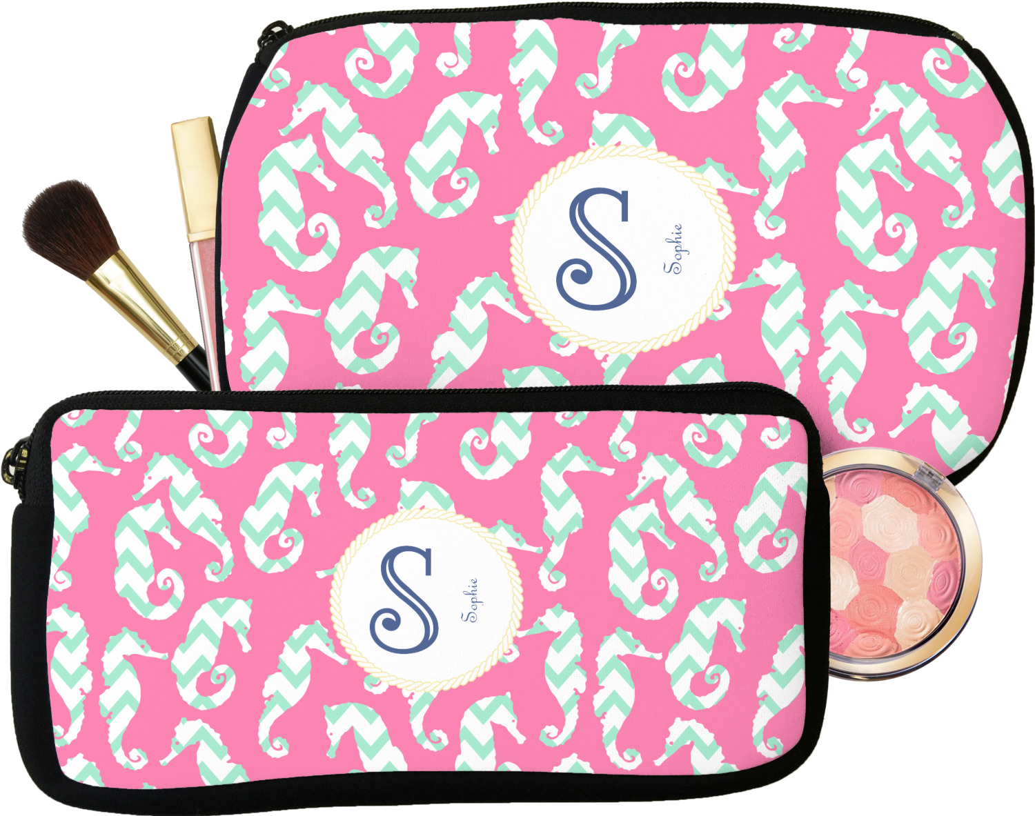 Our personalized makeup bags are available in many different designs, patterns and colors - so you are sure to find one that will love. They are made of neoprene (same material as wet-suits) and thus are water resistant, so spillages in your makeup bag will not end up all over you purse. They are customized on one side and are black on the other side and the zipper is black as well.