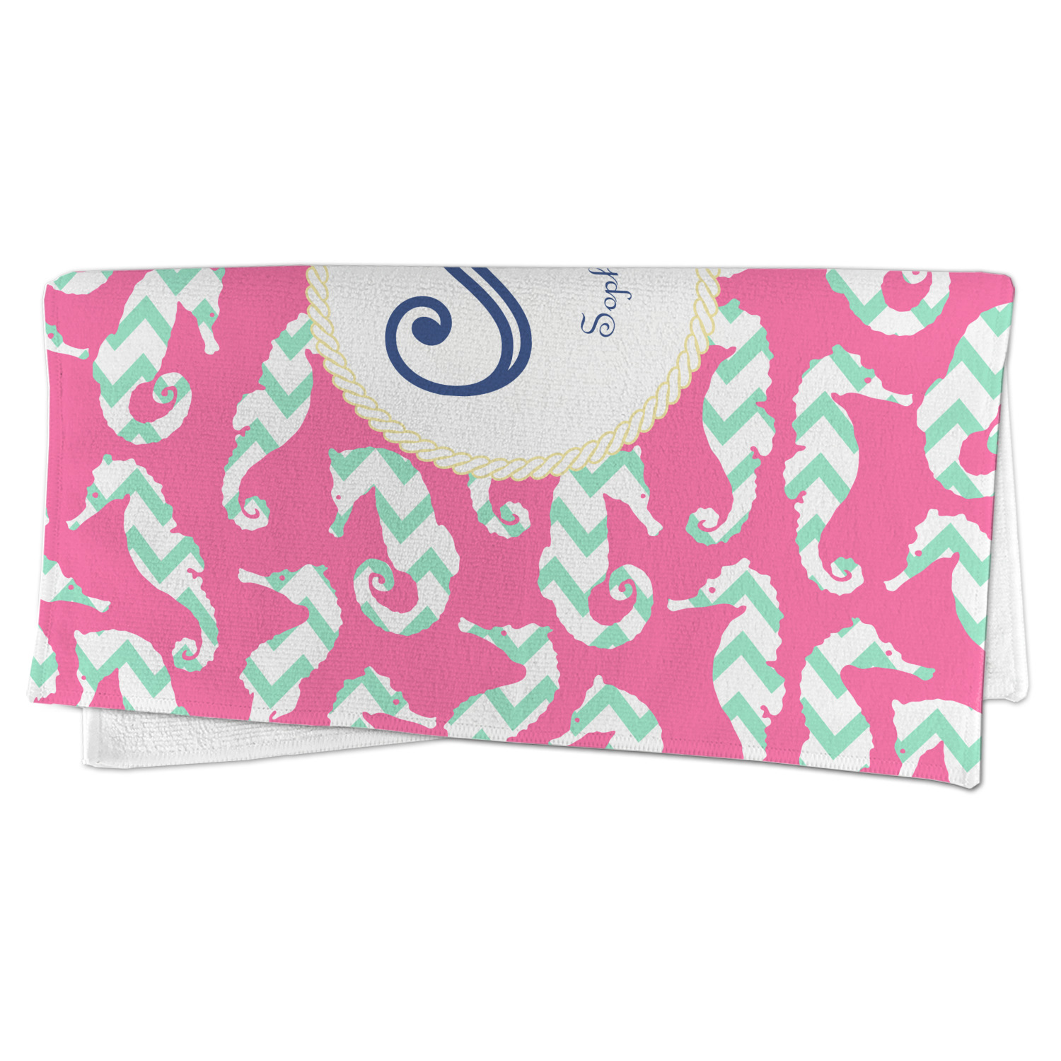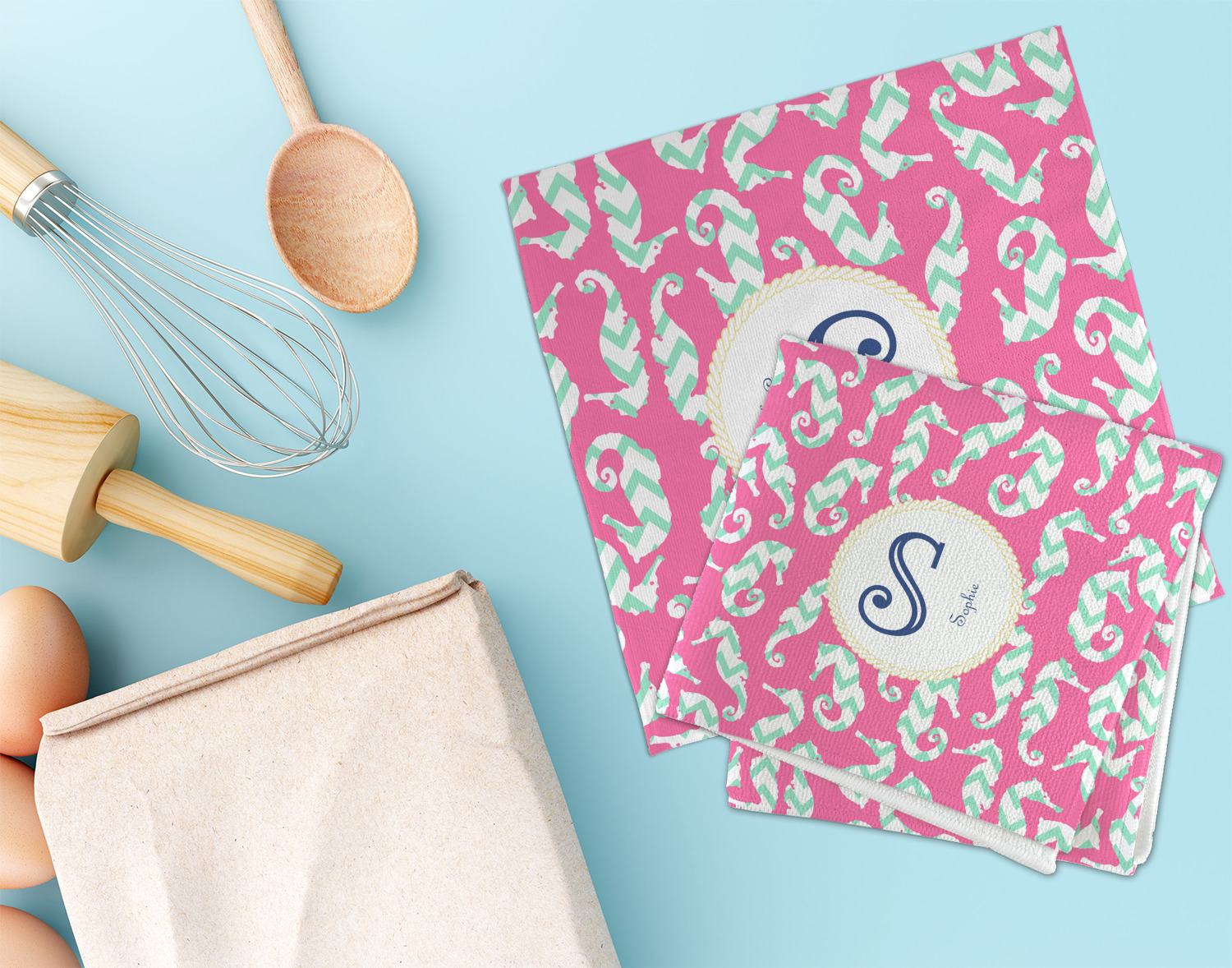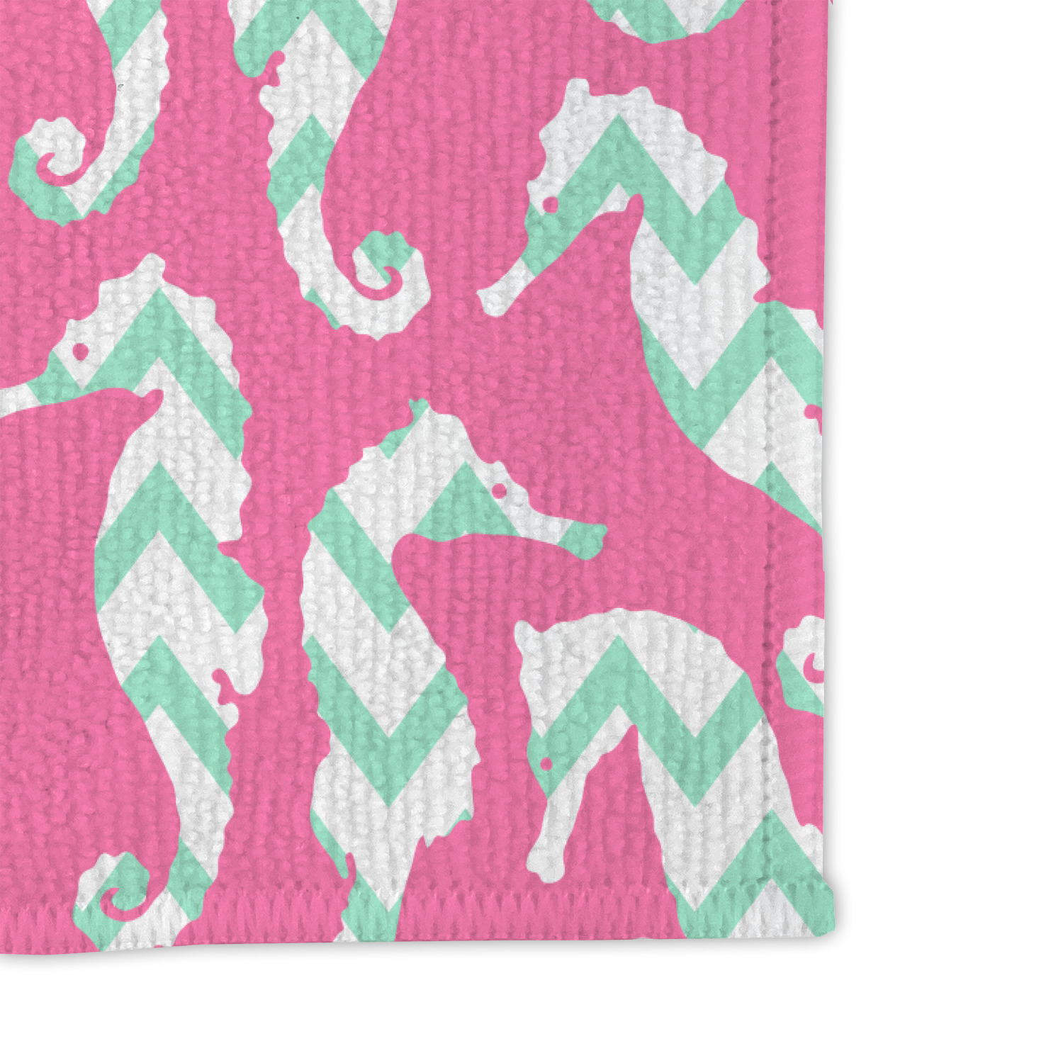 This sea horse design combines the beauty of seahorses with the fun loving chevron pattern. The design features mint, a bubble gum pink background and some gold colors, all of which can be customized to your favorite colors with just a few clicks!