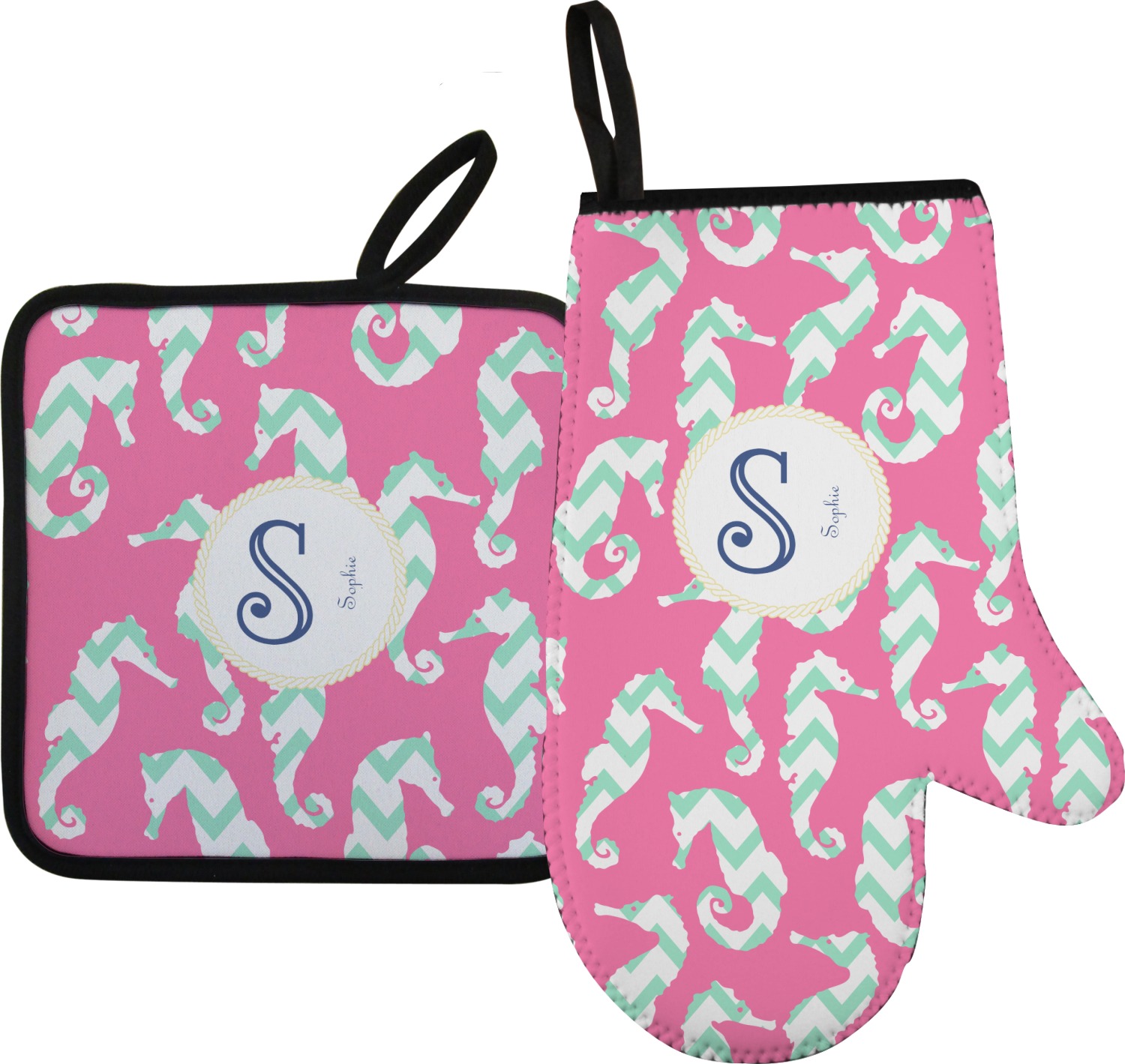 This sea horse design combines the beauty of seahorses with the fun loving chevron pattern. The design features mint, a bubble gum pink background and some gold colors, all of which can be customized to your favorite colors with just a few clicks!