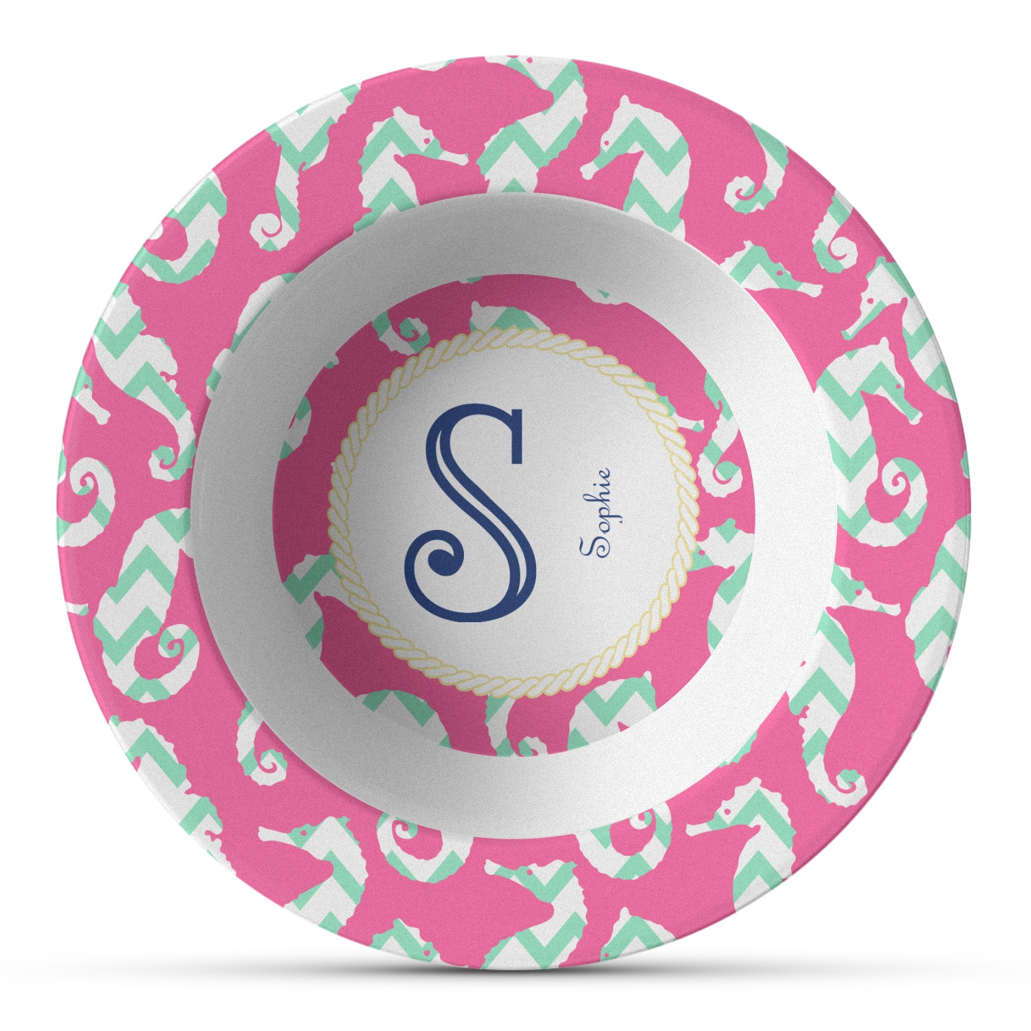 This sea horse design combines the beauty of seahorses with the fun loving chevron pattern. The design features mint, a bubble gum pink background and some gold colors, all of which can be customized to your favorite colors with just a few clicks!