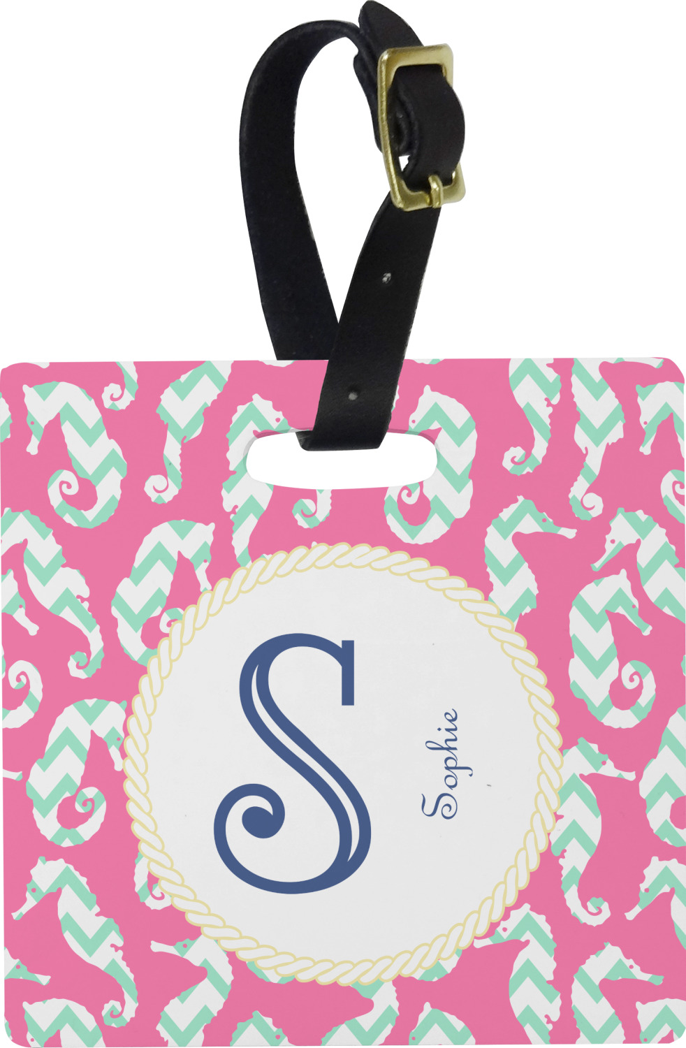 These personalized bag tags are sold in a variety of shapes, so that you may find the product that meets your vision exactly. We sell a round luggage tag, which measures at approximately 4" x 4". Our square luggage tag is about 3.5" x 3.5", while our rectangular version is 2.75" x 4 ".