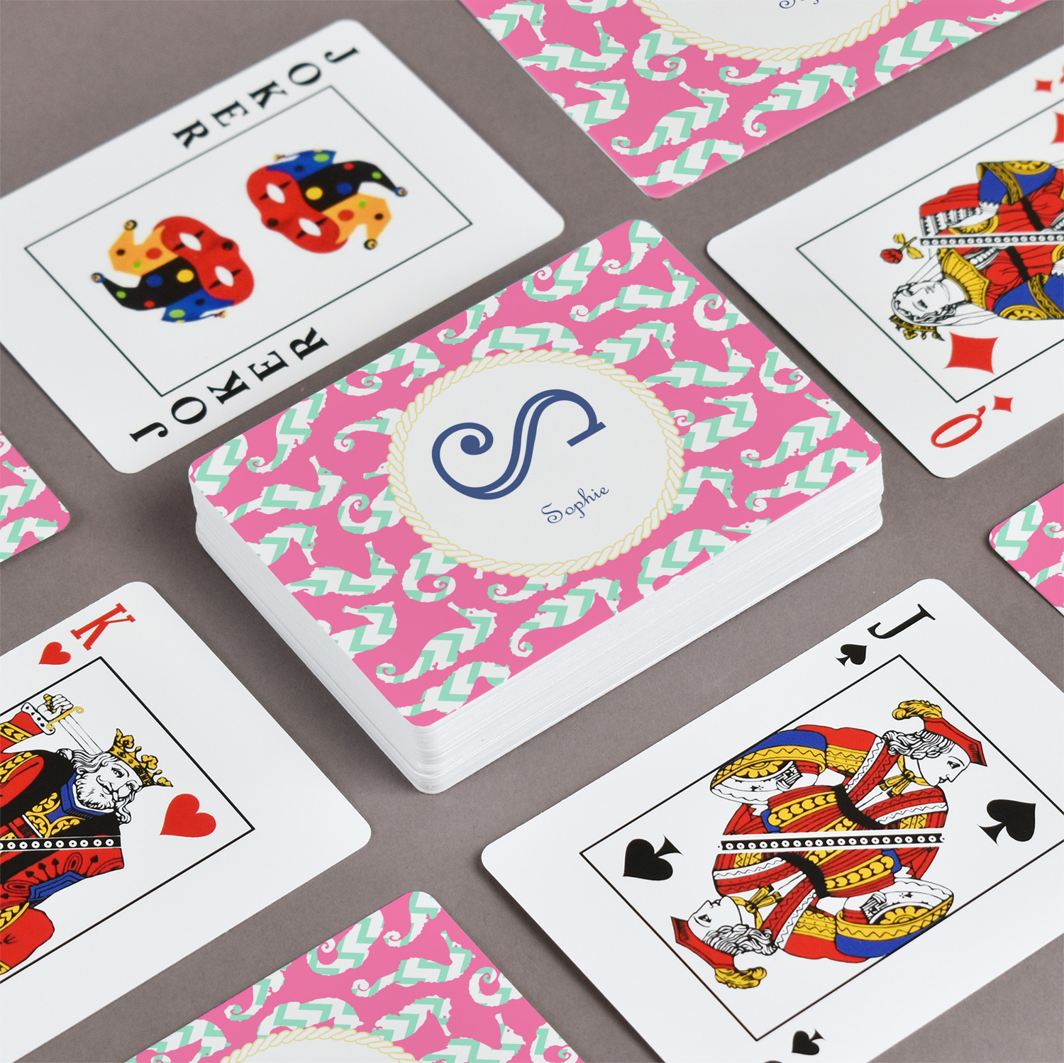 The customization / personalization is printed on the back side. The playing cards have a low gloss coating on both sides. The cards are packaged in a clear plastic box.