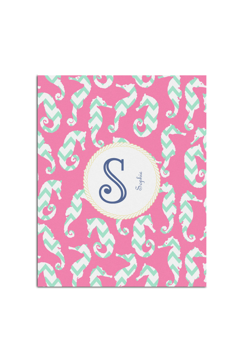 This sea horse design combines the beauty of seahorses with the fun loving chevron pattern. The design features mint, a bubble gum pink background and some gold colors, all of which can be customized to your favorite colors with just a few clicks!