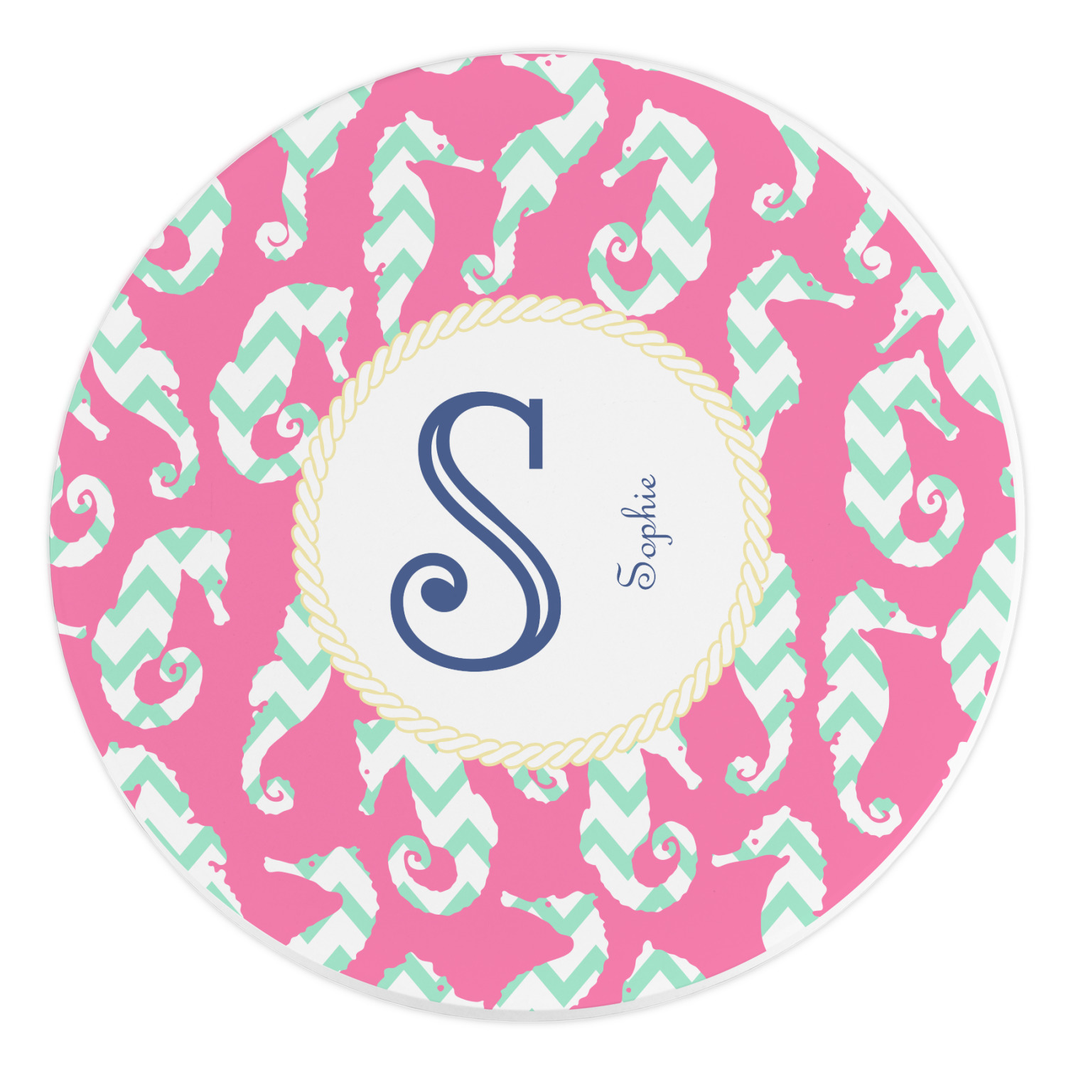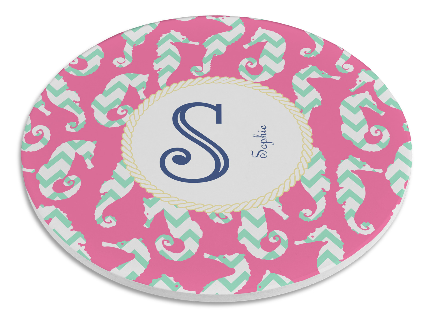 This sea horse design combines the beauty of seahorses with the fun loving chevron pattern. The design features mint, a bubble gum pink background and some gold colors, all of which can be customized to your favorite colors with just a few clicks!