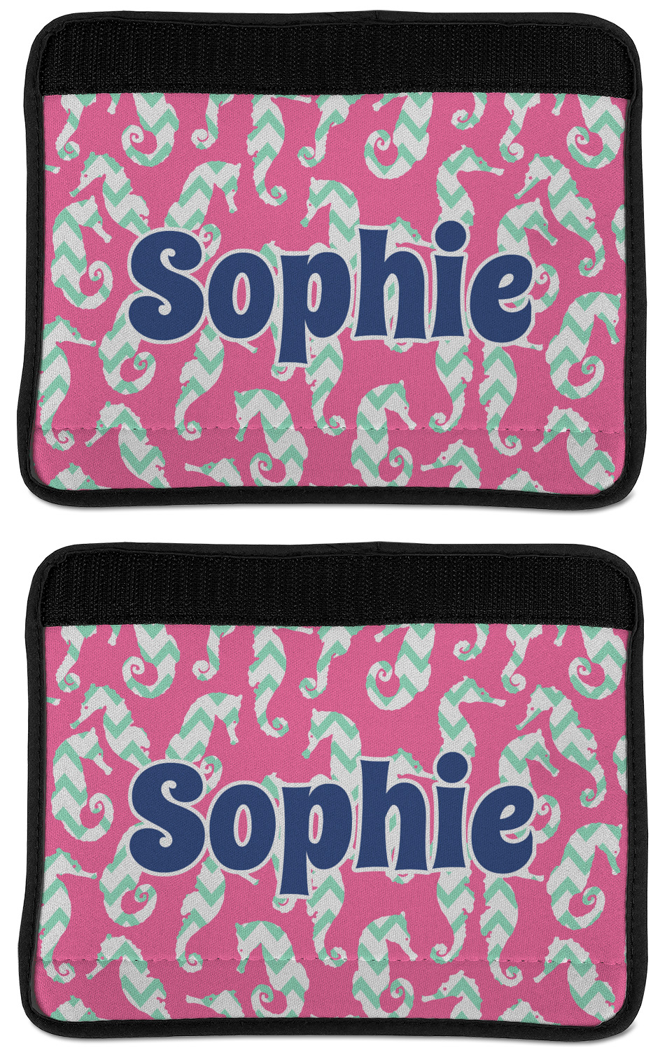 Made from neoprene, our seat belt strap covers wrap around the belt itself and have a Velcro tab for easy attachment and closure. The belt's edges are trimmed with a black polyester for a secure finish. Each cover is 9.5 by 7 inches when open and 9.5 by 2.5 inches when closed. We print your personalized design on the face of the seat belt pad.