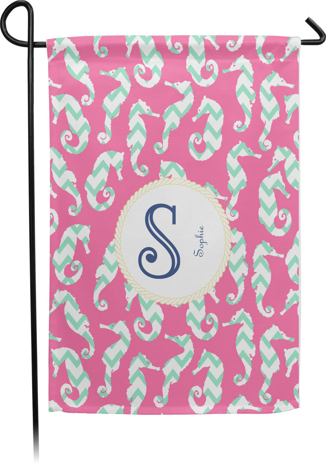 This sea horse design combines the beauty of seahorses with the fun loving chevron pattern. The design features mint, a bubble gum pink background and some gold colors, all of which can be customized to your favorite colors with just a few clicks!