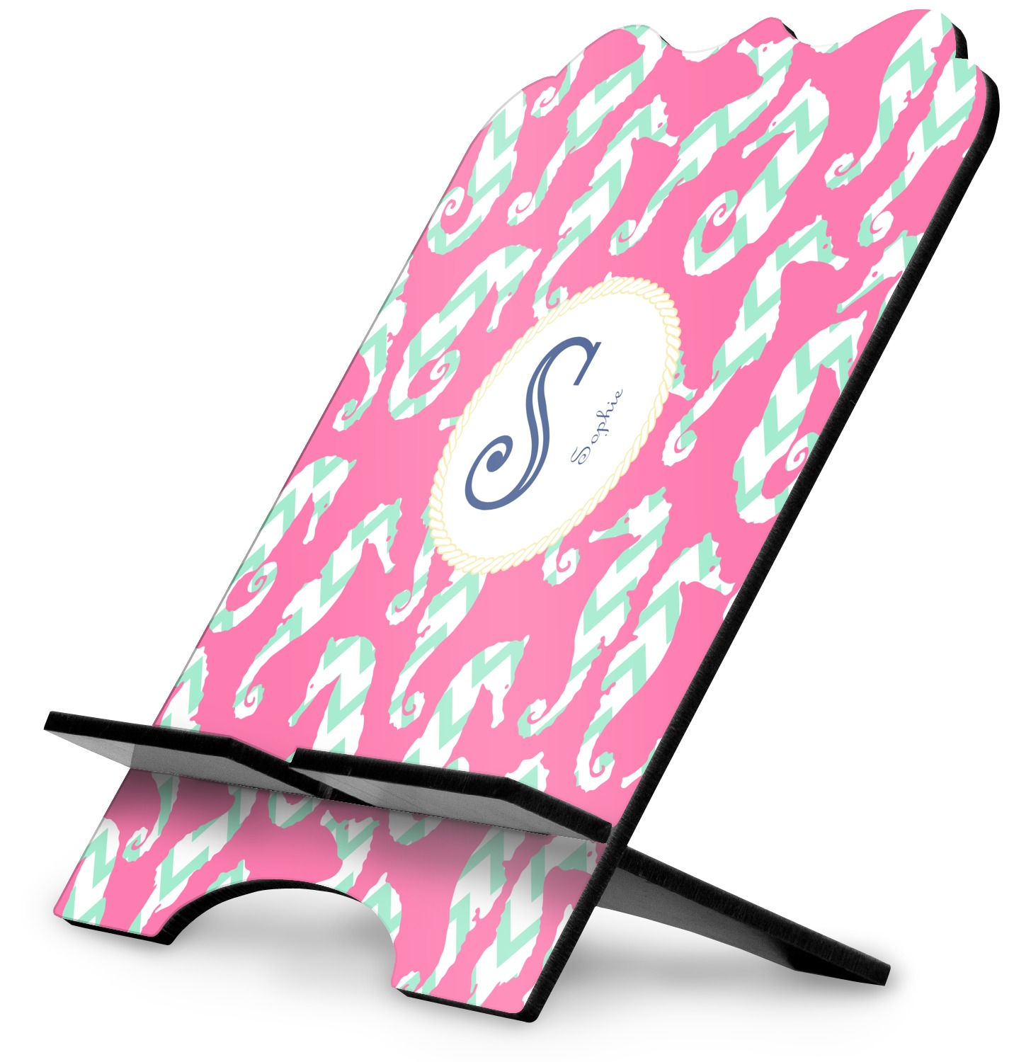 The stand is comprised of two hardboard pieces that fit snugly together and stabilize one another. The bottom part of the iPad stand supports your tablet, and has space for your tablets charger while in use. At 9.25" x 11.5", this tablet mount can support a device between the sizes of the iPad Pro and the iPad Mini 2. The uppermost part of the stand features a decorative, curved edge for a classy, suave appearance. We print your customization atop the face of the stand, in vibrant color. The remaining sides are colored a sleek black.