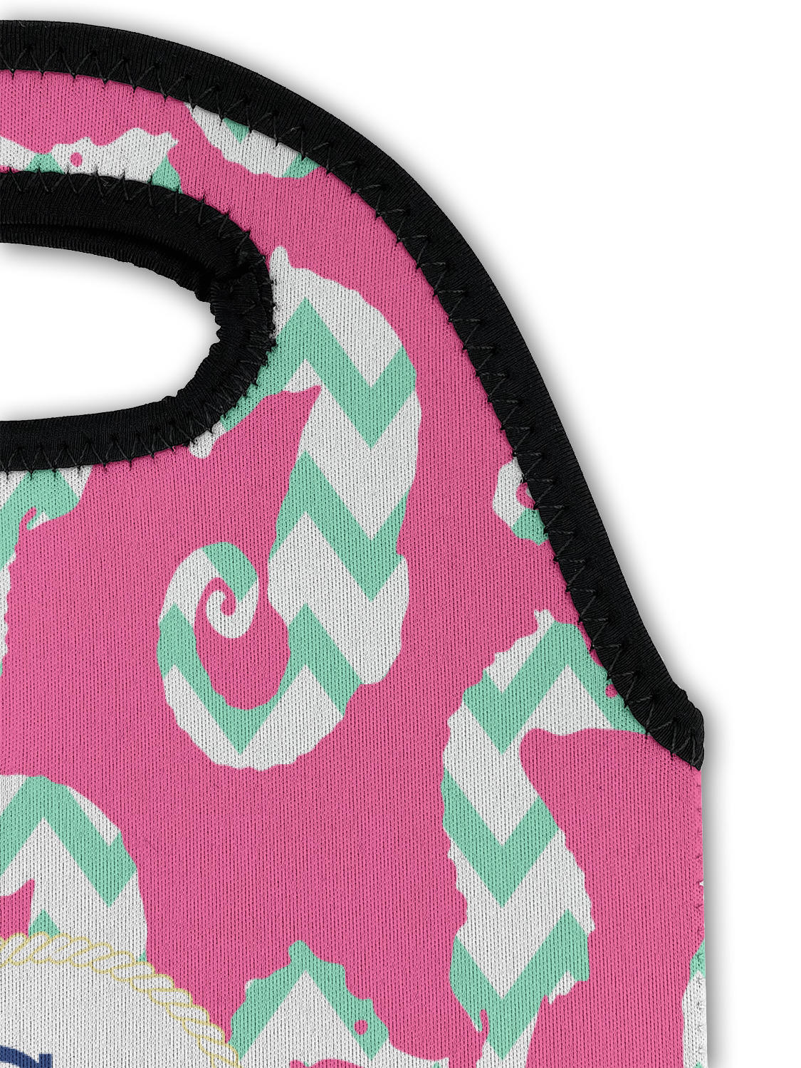This sea horse design combines the beauty of seahorses with the fun loving chevron pattern. The design features mint, a bubble gum pink background and some gold colors, all of which can be customized to your favorite colors with just a few clicks!