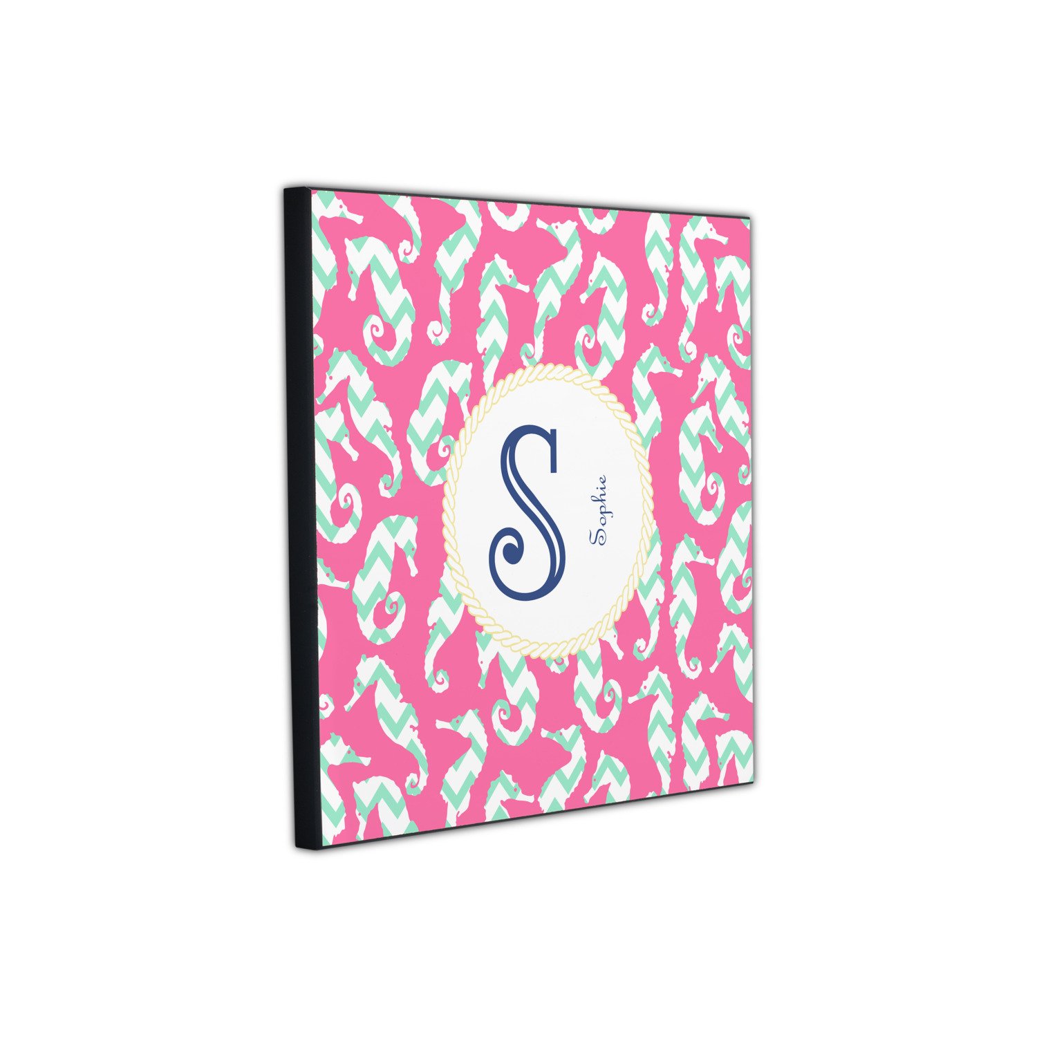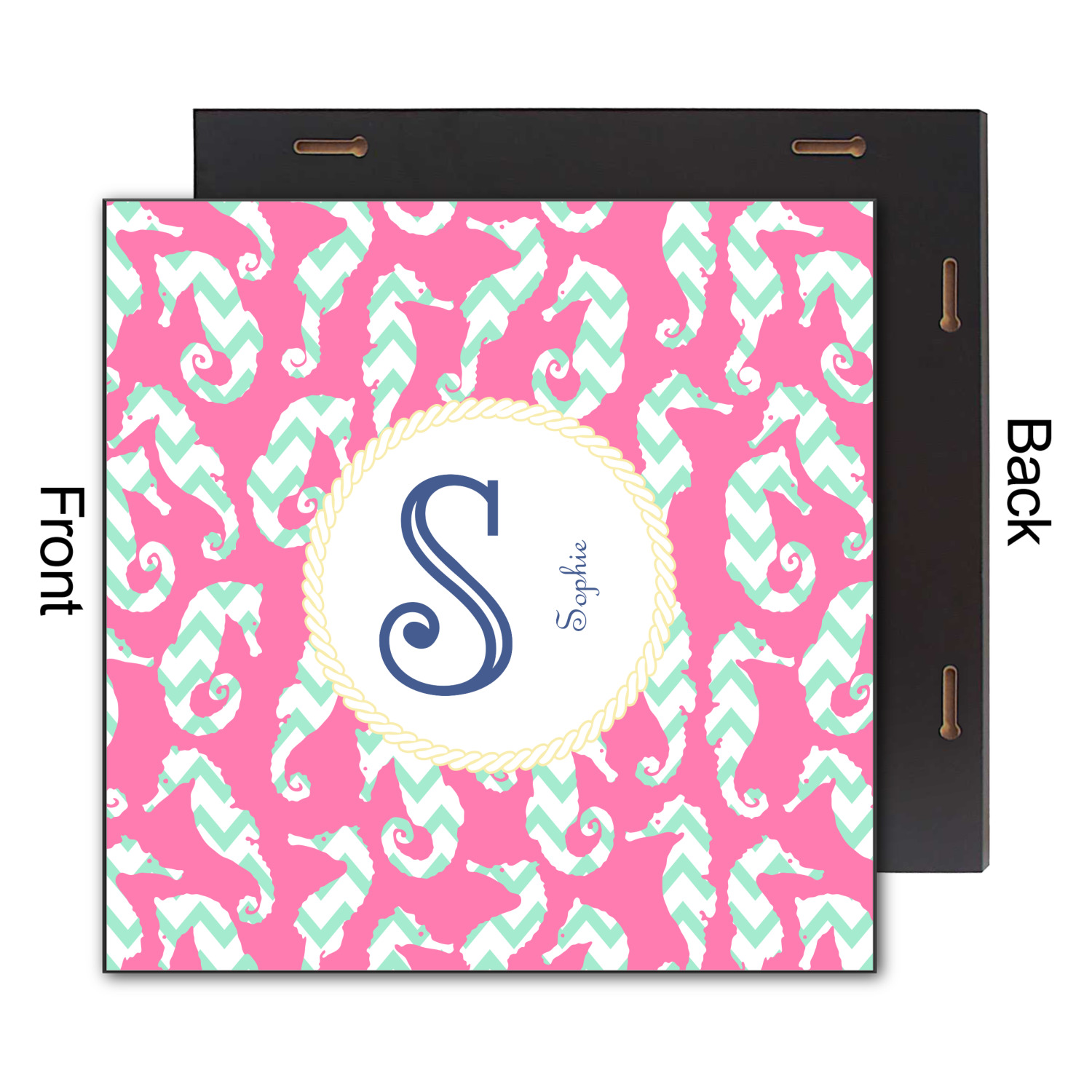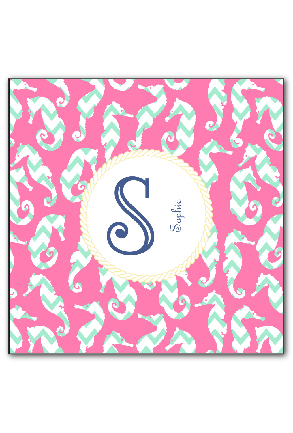 This sea horse design combines the beauty of seahorses with the fun loving chevron pattern. The design features mint, a bubble gum pink background and some gold colors, all of which can be customized to your favorite colors with just a few clicks!