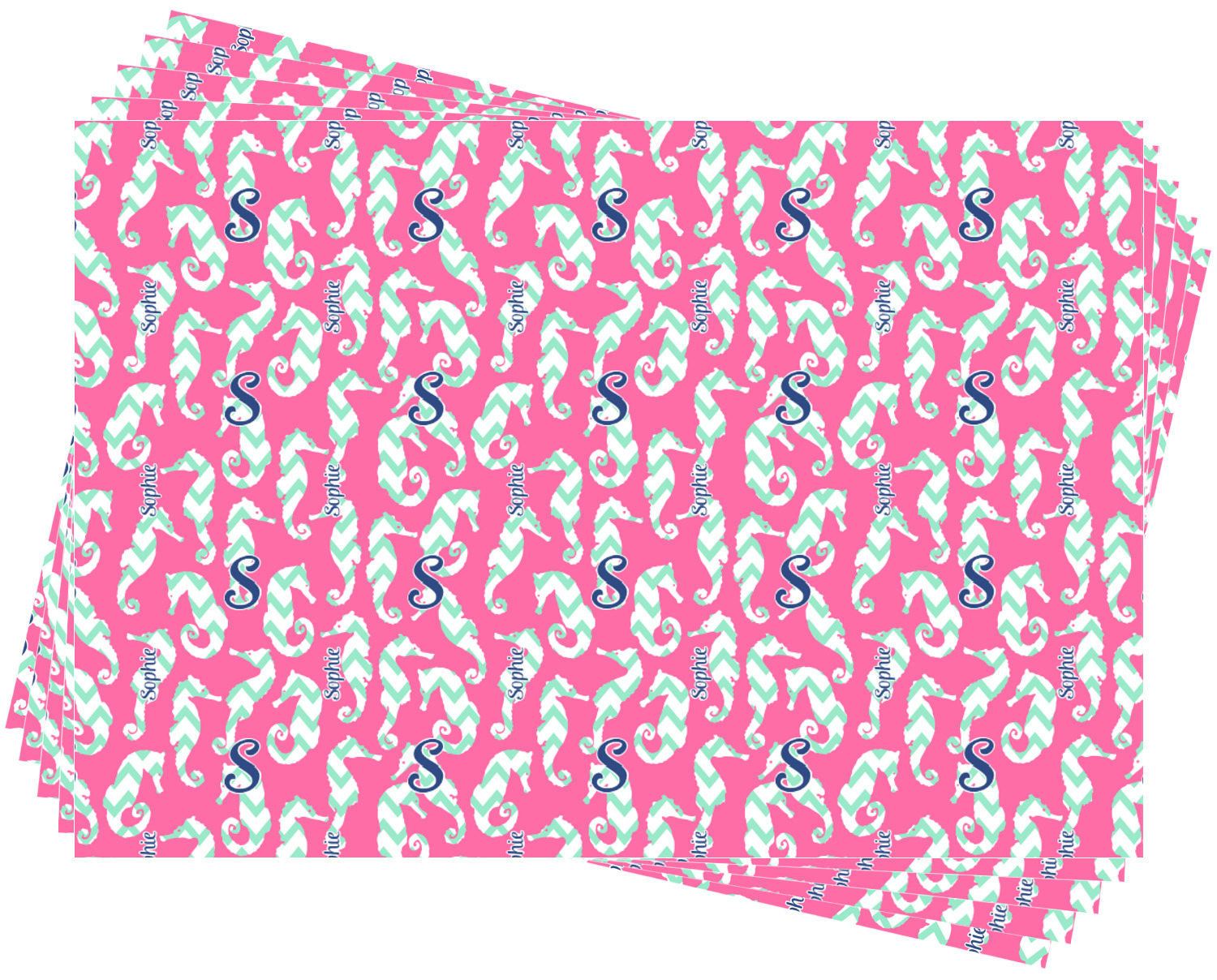This sea horse design combines the beauty of seahorses with the fun loving chevron pattern. The design features mint, a bubble gum pink background and some gold colors, all of which can be customized to your favorite colors with just a few clicks!