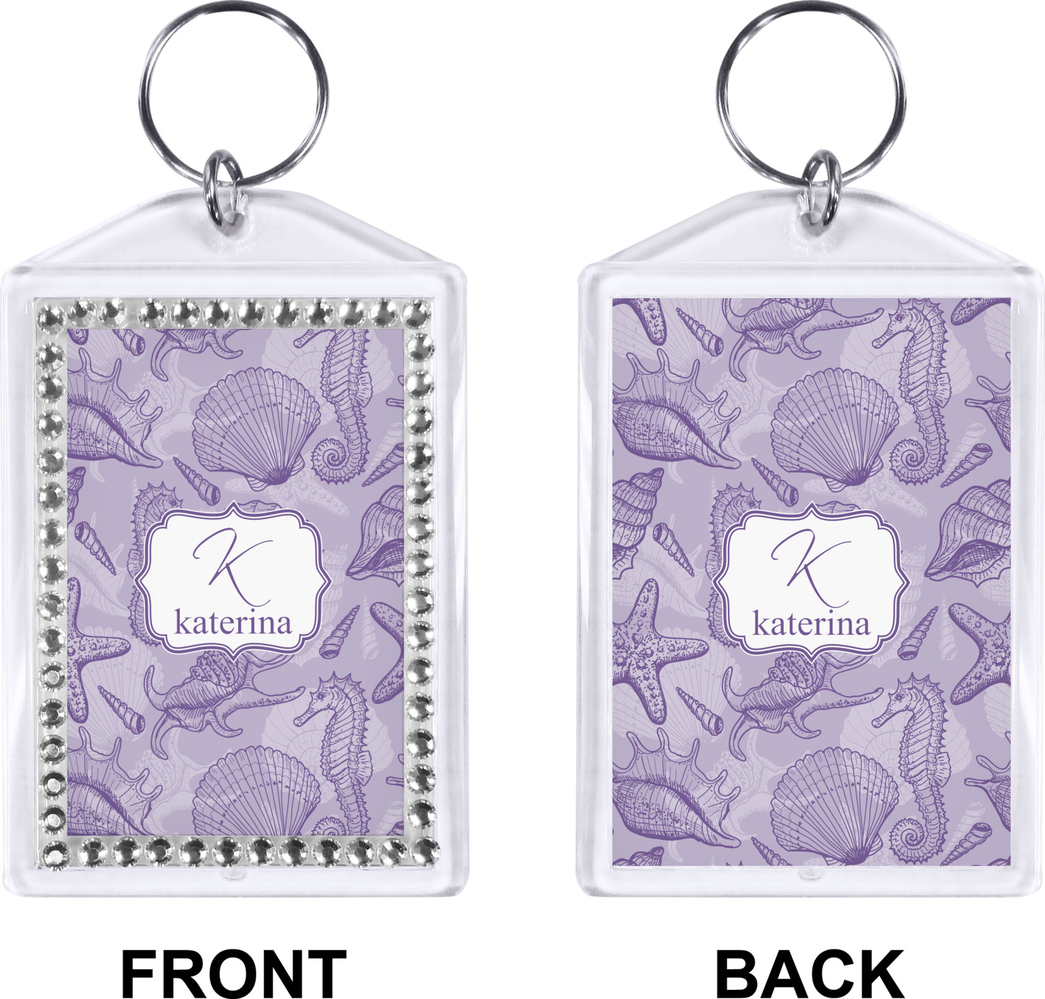 Our personalized keychains have a bold, rectangular shape, outlined by a series of shimmering rhinestones. A metal, split keyring is included with your purchase, and an additional metal hoop allows for attachment of the keychain to the split ring. This unique keychain measures at about 3.75 by 2.5 inches. We print your customized design(s) across both the back and front of this keychain.