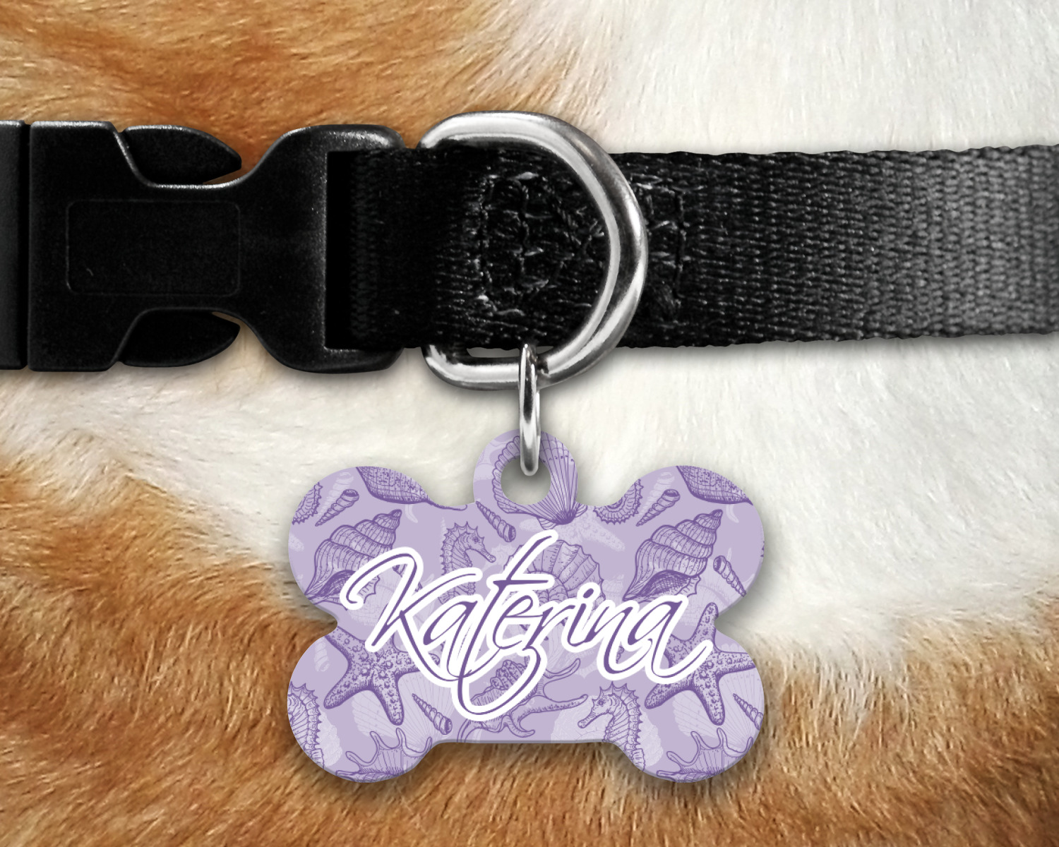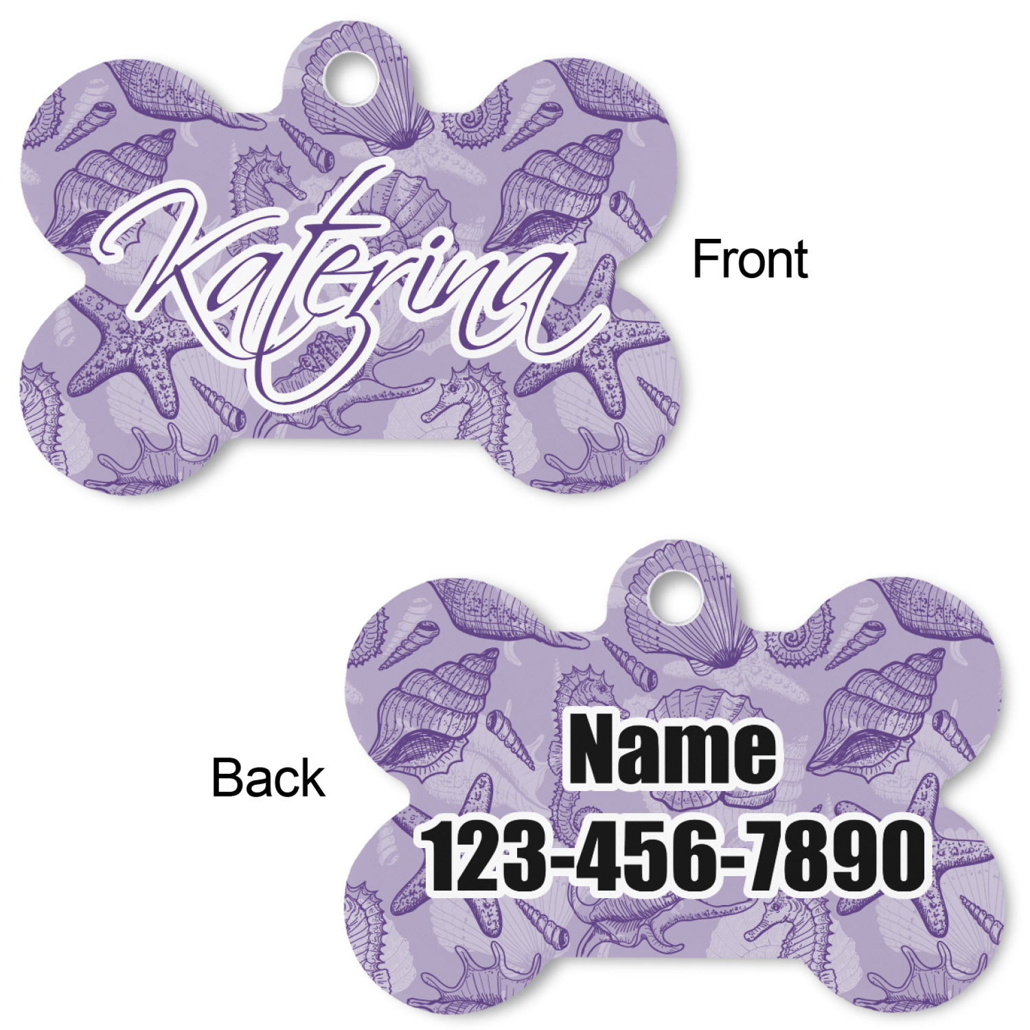 Our default design templates print your dog's personalization on the front and your contact information on the back; however everything is customizable, so you customize the patterns, the colors, the personalization, the contact information etc.