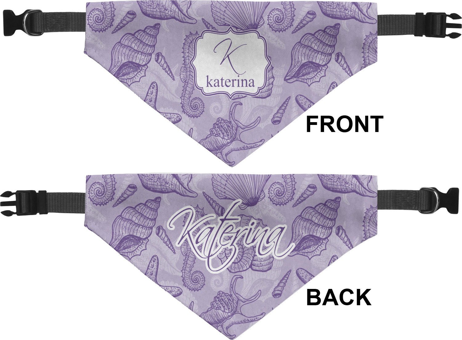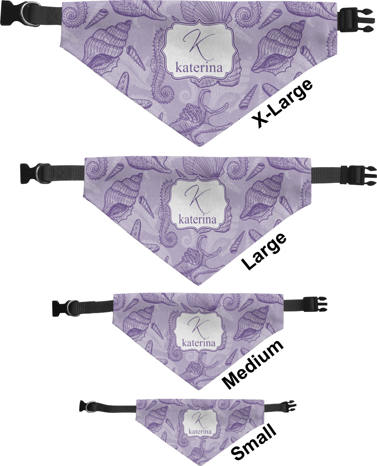 We print the front and back of these dog bandanas with your customized design. The bandana itself is made from a durable polyester, sewn together with a gap large enough to accommodate any collar. Regardless, the bandana includes a plain black, canvas collar with plastic snaps, that can easily be removed if desired. These dog bandana collars are available in four sizes: small, medium, large, and extra large. Please see our sizing chart for more information regarding the dimensions of each size.