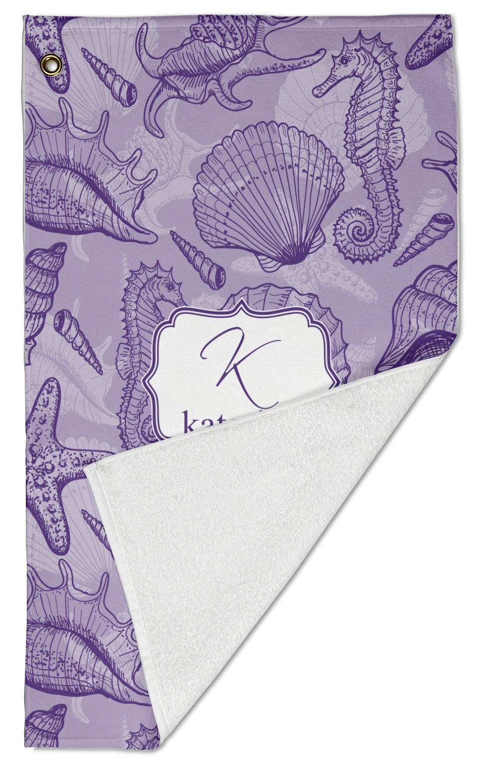 The towel is fully printed / patterned on the front polyester side; and is white on terrycloth cotton backside. The towel has grommet and a pear spring clip in the top left corner. Our golf towels are available in 100s of different prints and patterns.