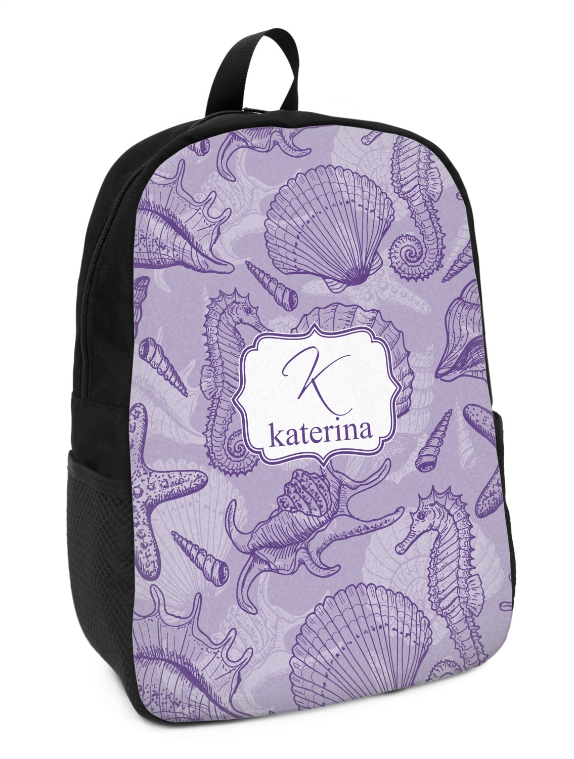 These small backpacks are made of a durable black canvas material with your personalization right on the front. The two shoulder straps are padded and easily adjustable. The bag itself measures at about 11" W x 15" H x 5" D. It's the perfect size for elementary aged kids or adults who want a smaller backpack. On the top of the bag you will find a handle to hang or carry your backpack by as well as a large zipper closure to keep all of your belongings safe inside. On each side of your backpack is a mesh pocket for a small item or water bottle. Inside your backpack you will find a spacious area with a small zipper pocket and a padded laptop slot that will fit up to a 13" laptop (13" being very snug). This is the perfect bag for any student that needs a couple books and their laptop with them at all times. It also works great as a carry on for traveling!