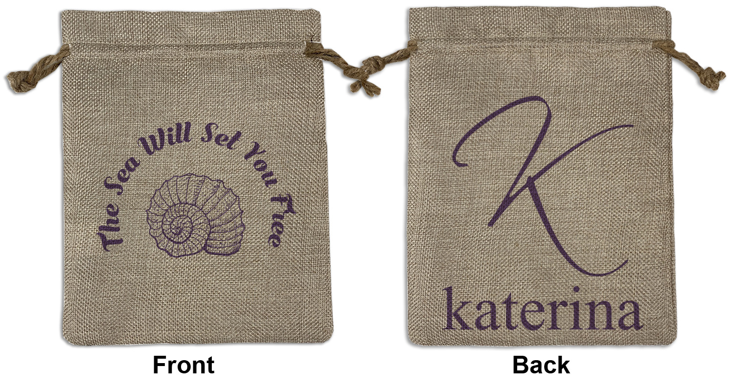 We sell our Burlap Gift Bags in 3 variant sized bags. Made with burlap polyester, each personalized bag can be secured with a twine drawstring pull. Your custom design is available to print on one side or both sides - completely up to you! The sizes of the bags measure approximately 4.5" x 6.5" for the smallest size, 6.5" x 8.0" for the medium size, and 6.5" x 13.5" for the large-sized bag.