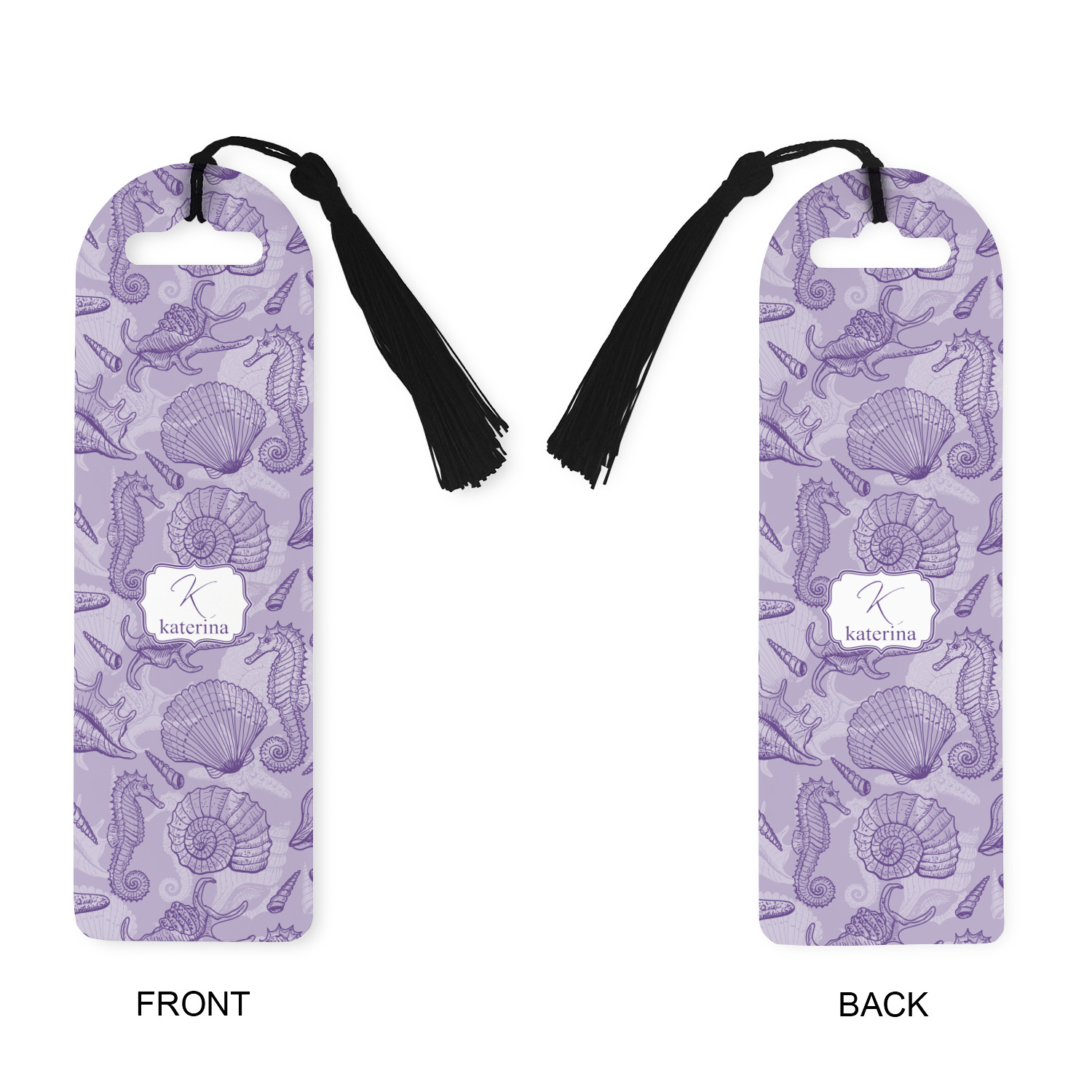 Made from a durable, flexible plastic, these bookmarks are printed with your custom design on them. With the tassel on them they make it easy to find your page in your book. These are a rectangular shape 7 1/4 inches tall with a rounded top and are approximately 2 1/4 inches wide.