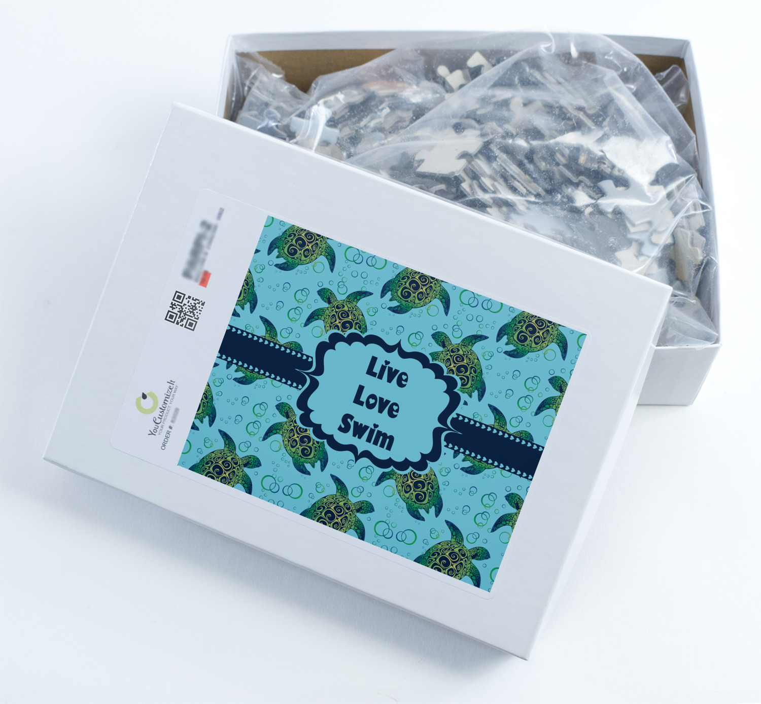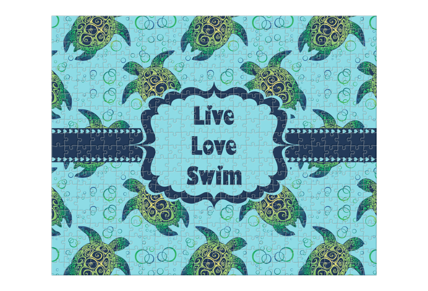 We chose a calming teal for the entire background, navy blue for the turtles background color along with a navy blue ribbon and label. We chose the hearts ribbon, a fancy label and live, love swim for personalization in the hearts font