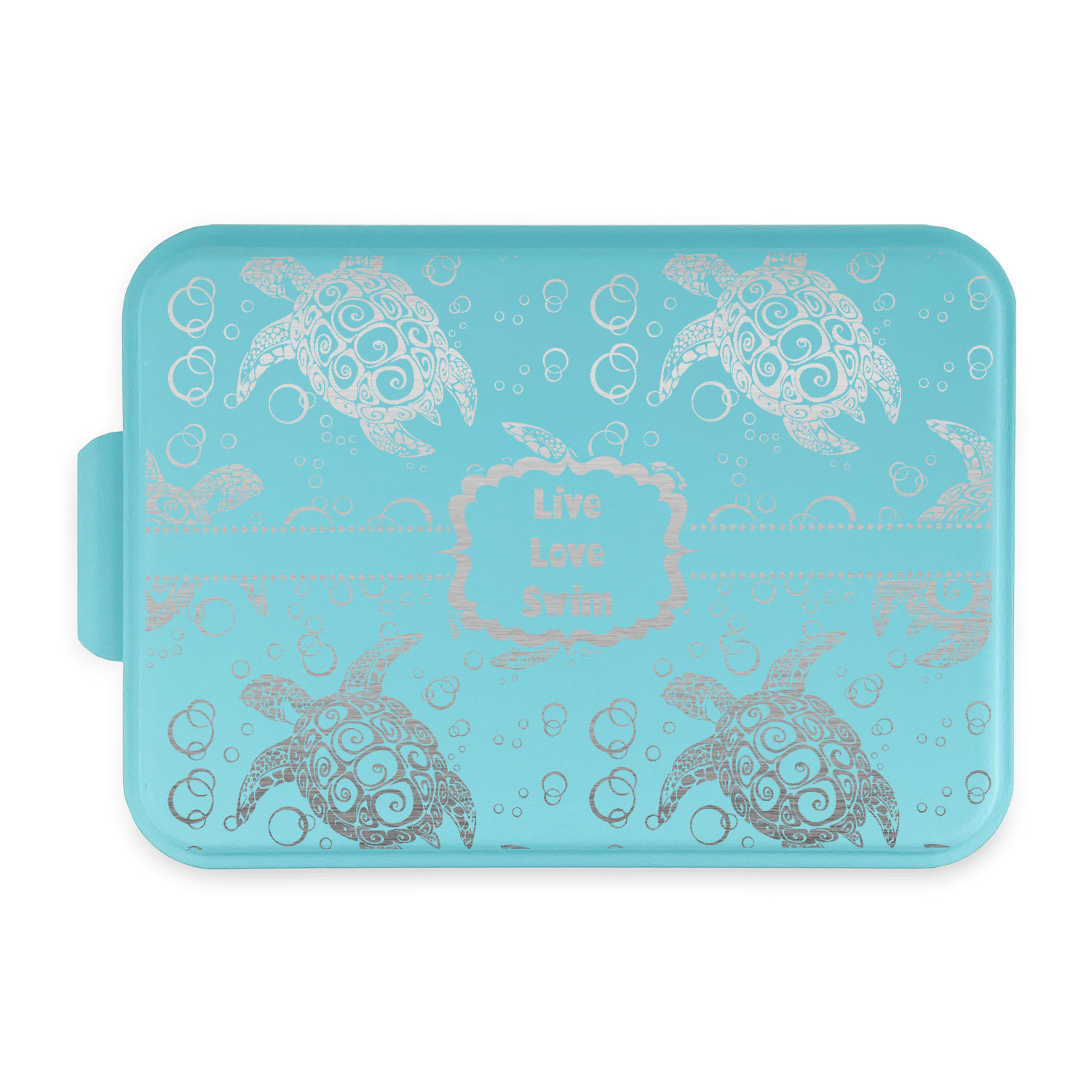 We chose a calming teal for the entire background, navy blue for the turtles background color along with a navy blue ribbon and label. We chose the hearts ribbon, a fancy label and live, love swim for personalization in the hearts font