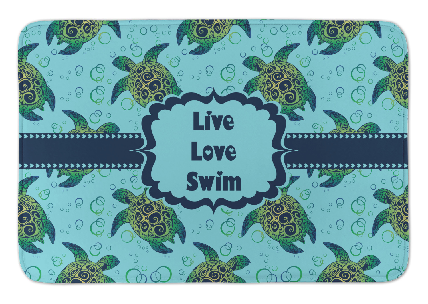 We chose a calming teal for the entire background, navy blue for the turtles background color along with a navy blue ribbon and label. We chose the hearts ribbon, a fancy label and live, love swim for personalization in the hearts font