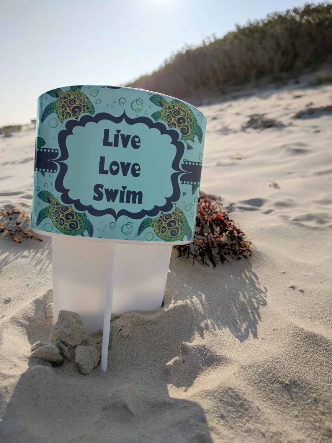 We chose a calming teal for the entire background, navy blue for the turtles background color along with a navy blue ribbon and label. We chose the hearts ribbon, a fancy label and live, love swim for personalization in the hearts font