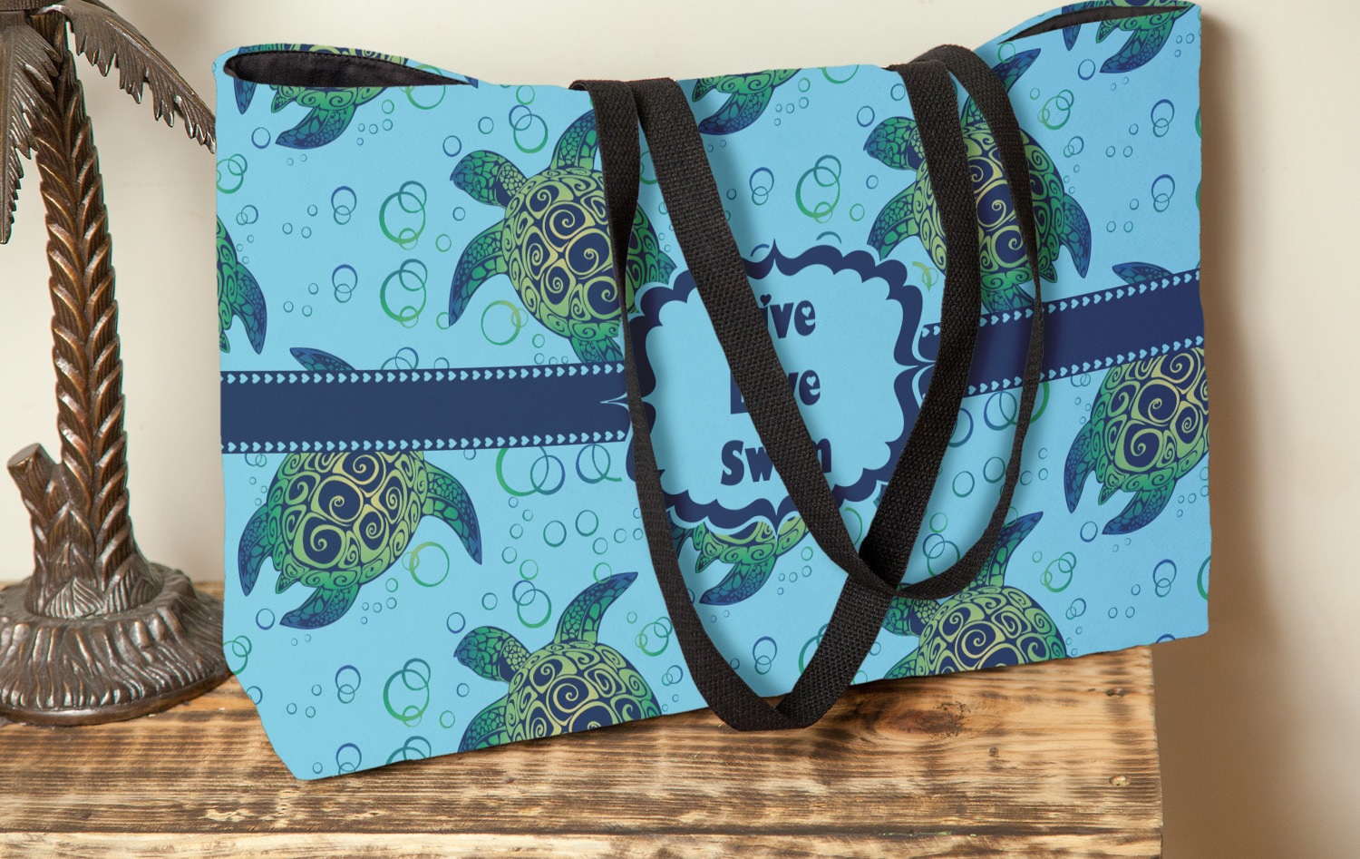 The totes are made from a sturdy canvas material on the outside and are lined with a black poly cotton lining. The beach totes have an approx. 28" black woven handles.