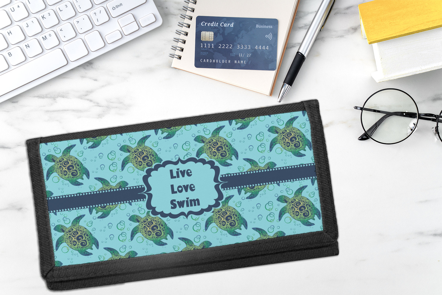 Our sea turtles design is absolutely gorgeous. The background of our design has sea turtles along with water bubbles swimming in a very calming teal blue water. This design can be customized with your colors.