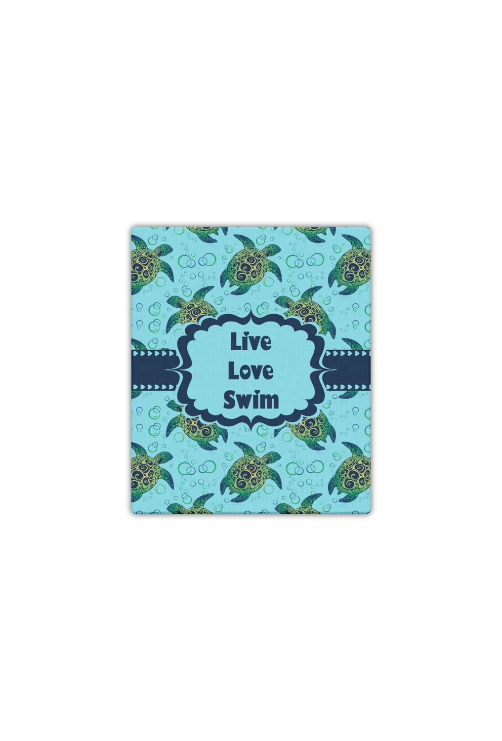 We chose a calming teal for the entire background, navy blue for the turtles background color along with a navy blue ribbon and label. We chose the hearts ribbon, a fancy label and live, love swim for personalization in the hearts font