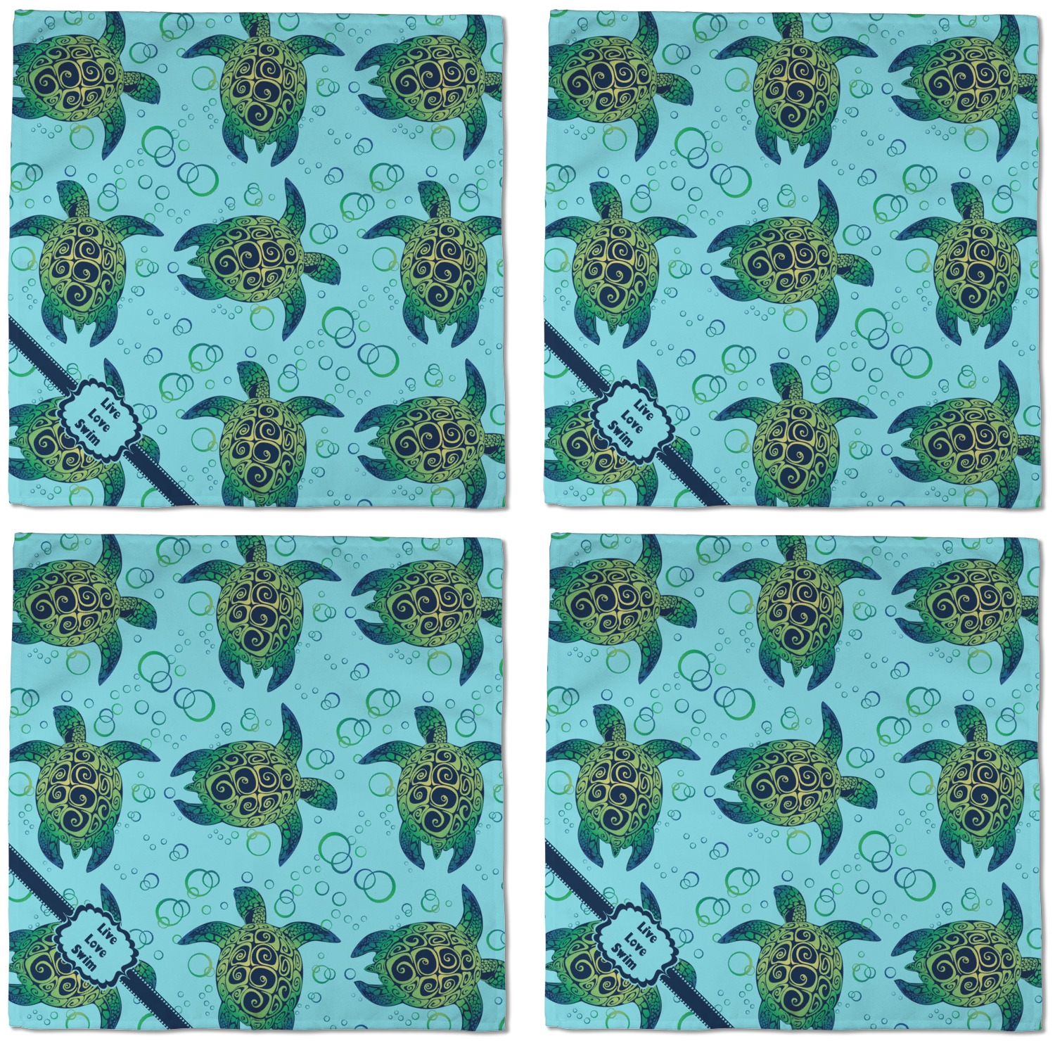 We chose a calming teal for the entire background, navy blue for the turtles background color along with a navy blue ribbon and label. We chose the hearts ribbon, a fancy label and live, love swim for personalization in the hearts font