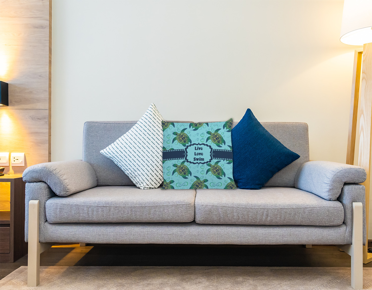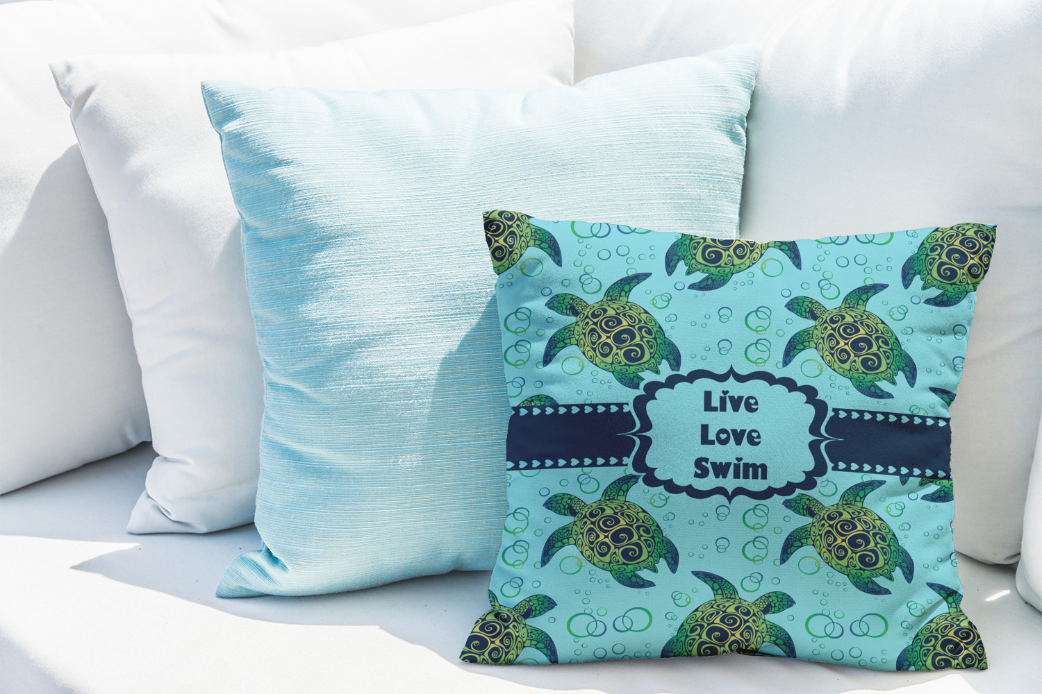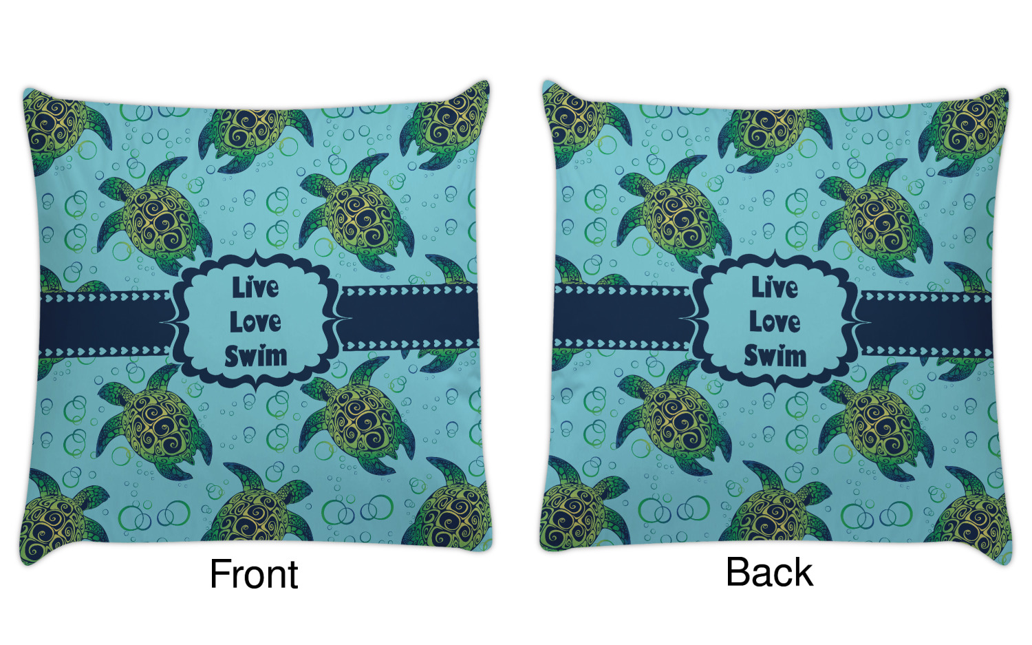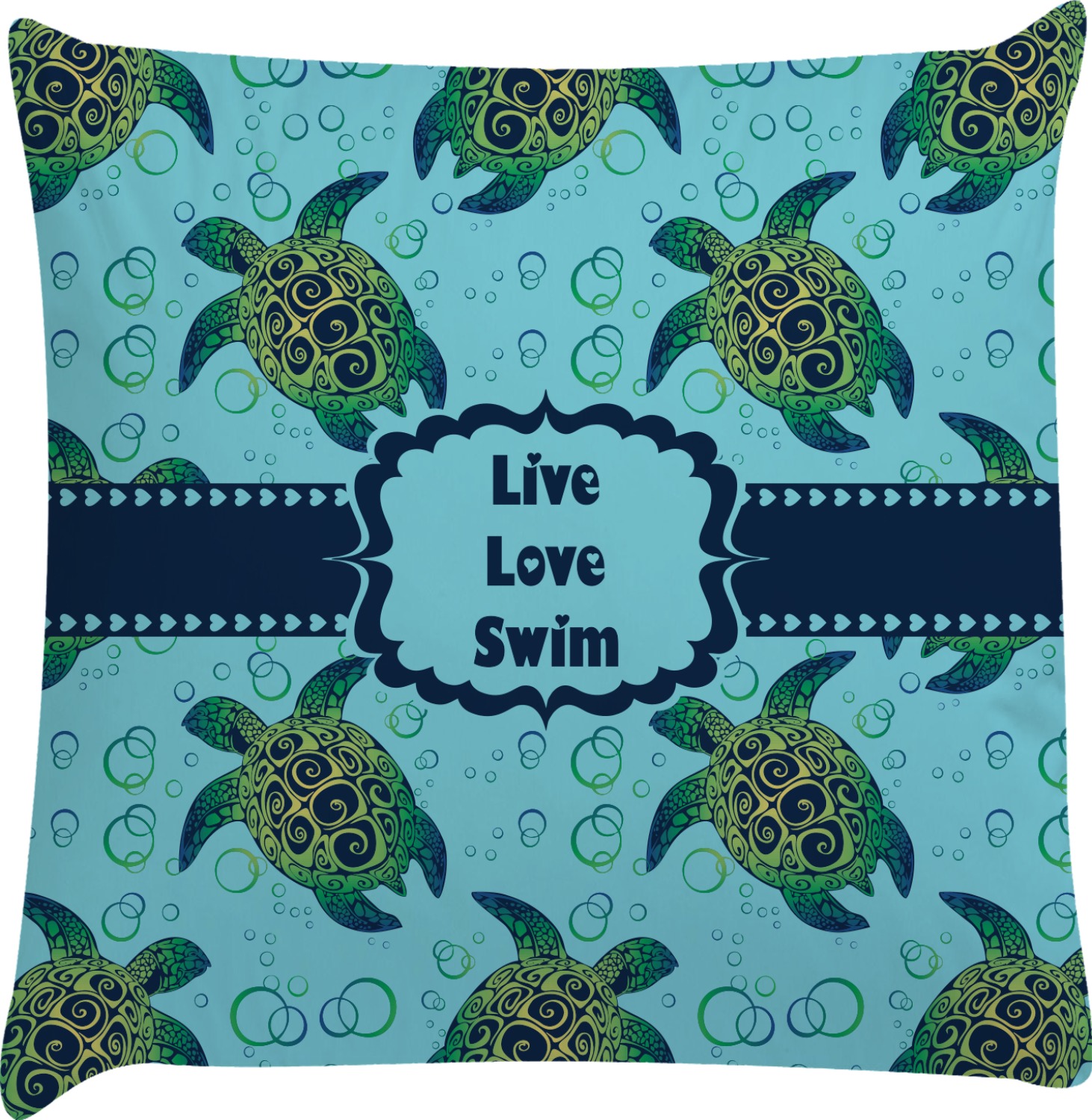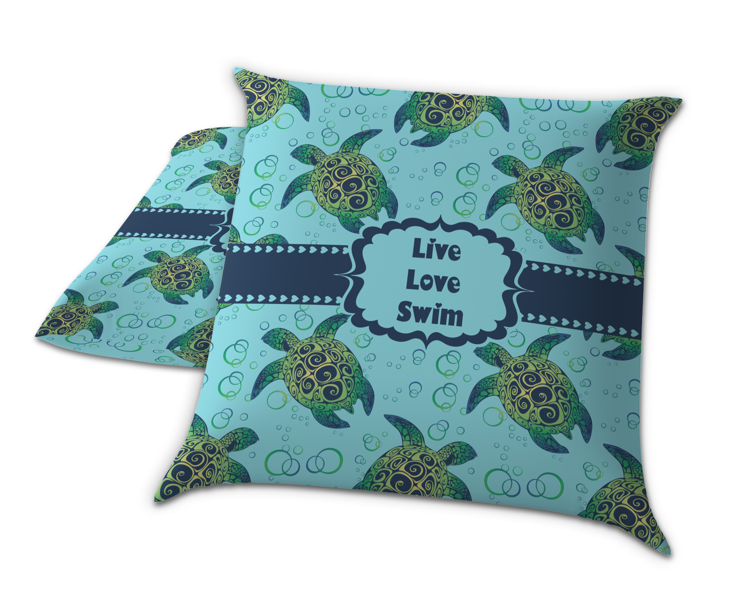 We chose a calming teal for the entire background, navy blue for the turtles background color along with a navy blue ribbon and label. We chose the hearts ribbon, a fancy label and live, love swim for personalization in the hearts font
