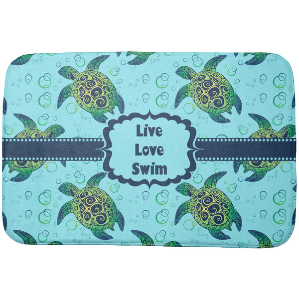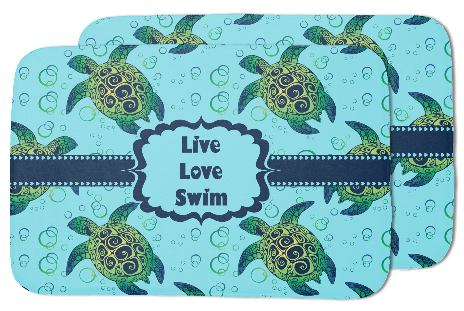 We chose a calming teal for the entire background, navy blue for the turtles background color along with a navy blue ribbon and label. We chose the hearts ribbon, a fancy label and live, love swim for personalization in the hearts font