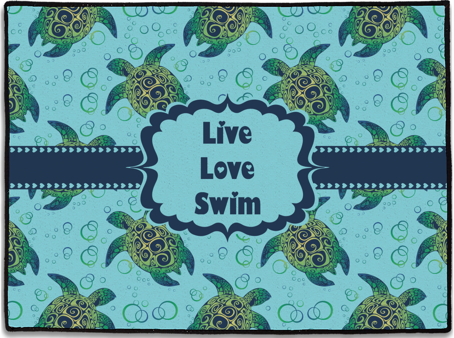 We chose a calming teal for the entire background, navy blue for the turtles background color along with a navy blue ribbon and label. We chose the hearts ribbon, a fancy label and live, love swim for personalization in the hearts font